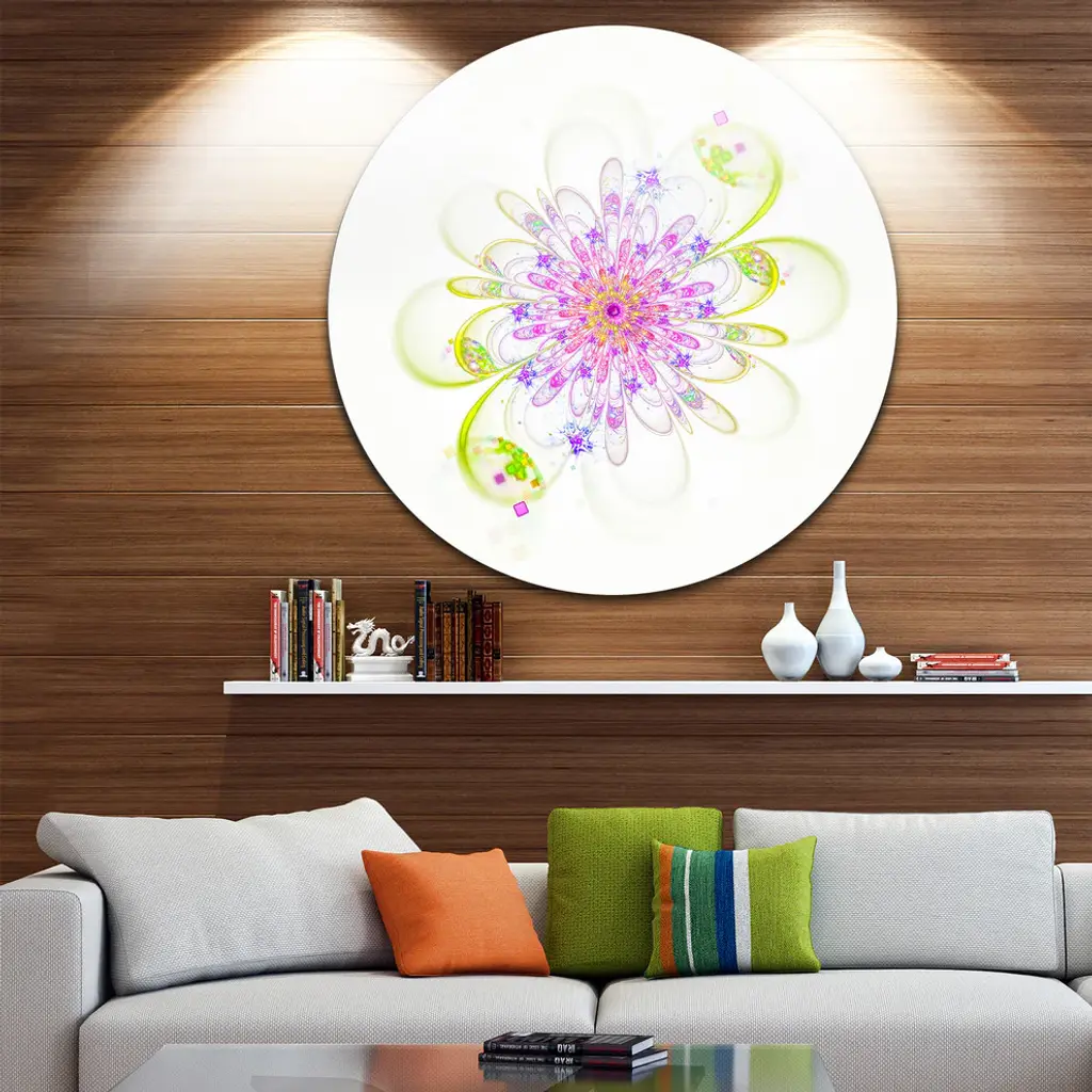 Bring Contemporary Abstraction to your home with this large Circle Metal wall art. This Purple Green Glowing Fractal Flower Metal Artwork makes it the focal point of any room or office. - White Gloss Coating ensures colors are extra vibrant with light reflection.- Aluminum grade Sheet Metal with 1 inch mounting frame on the back giving the illusion that the artwork is floating on the wall..- Mounting Brackets are included along with instructions.- High Quality Digital images are created directly into a glossy aluminum panel producing a stunning and captivating print into the glossy finish of the metal.- Water, Fire and Scratch resistant HD Aluminum panels.- Looks better than any photo paper and guaranteed to last at least 20 years- Easy to clean with a microfiber cloth. Colors are far superior to regular Canvas Art. - Easy to Hang