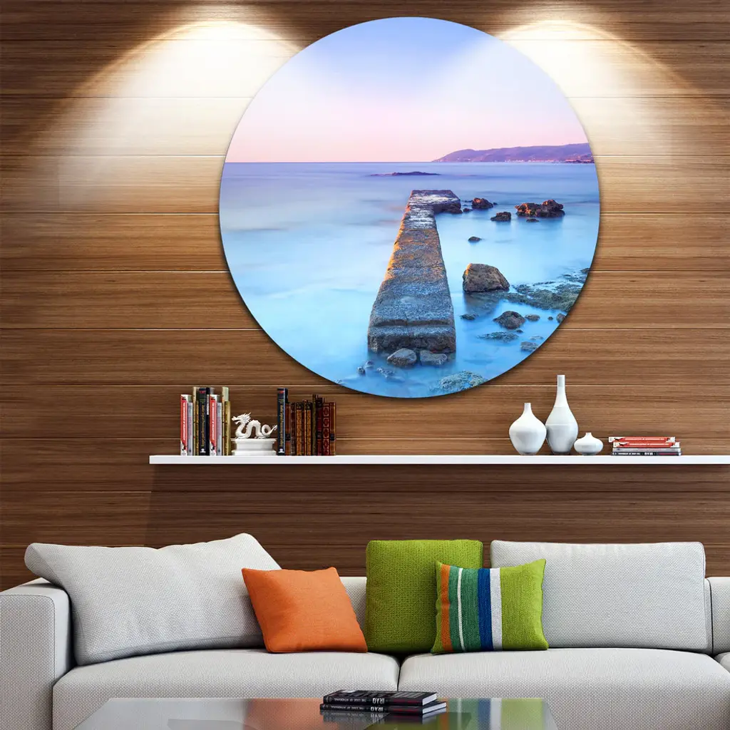 Purple Sea And Sky, Seascape Photo Round Metal Wall Art, 36"