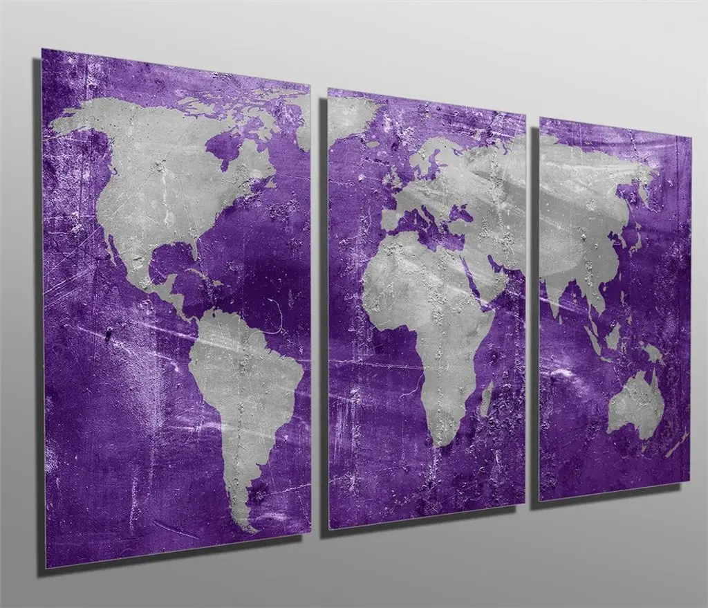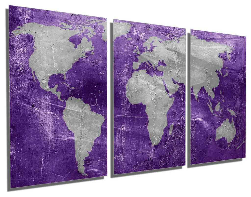 48"œ x 24"œ total size. Ready To Hang! (3 pieces - 16"œ x 24"œ each). 3 Panel Split (Triptych) Abstract art World Map Metal Print ft. shades of purple and silver colors. Modern metal wall art for home or office wall decor & interior design. Printed on Luxurious, HD aluminum glossy metal panels. Multi panel art.. HD aluminum panels. Metal print wall art. Includes Shadow Wall Mount on the back.• Aluminum Metal Wall Art• Made in USA• Ready to hang - No assembly required• Shadow mount hardware on the back• 0.045"œ thick HD Aluminum Panels• Scratch resistant, glossy finish• Superb color clarity, luxurious prints• Epson printing process• For indoor or moisture rich environment use• Easy to clean. Gently wipe with microfiber cloth.