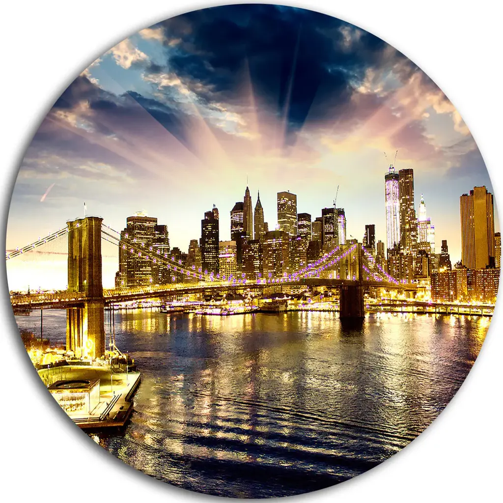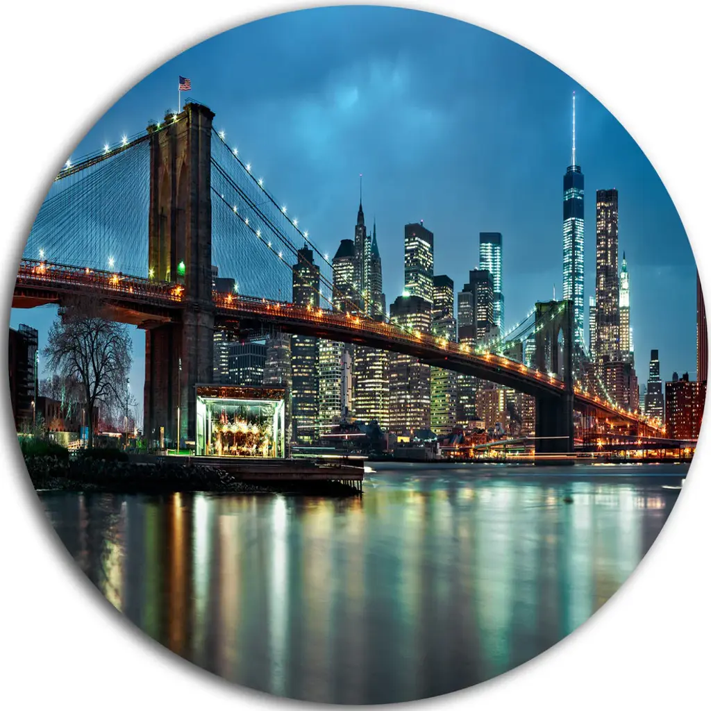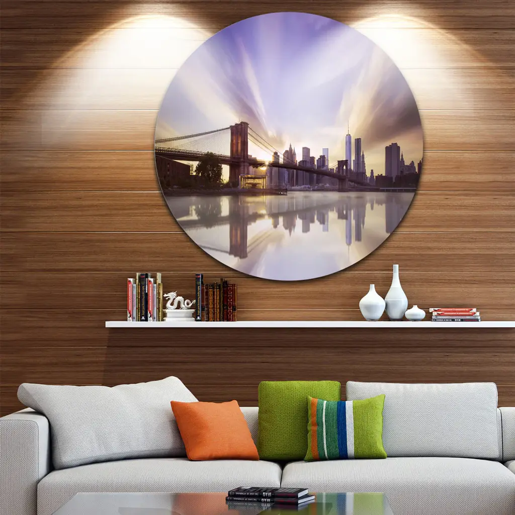 Purple Sky Over Brooklyn Bridge, Cityscape Photo Disc Metal Art, 11"