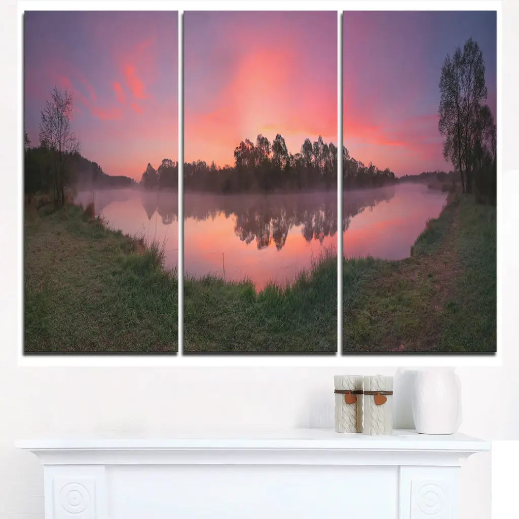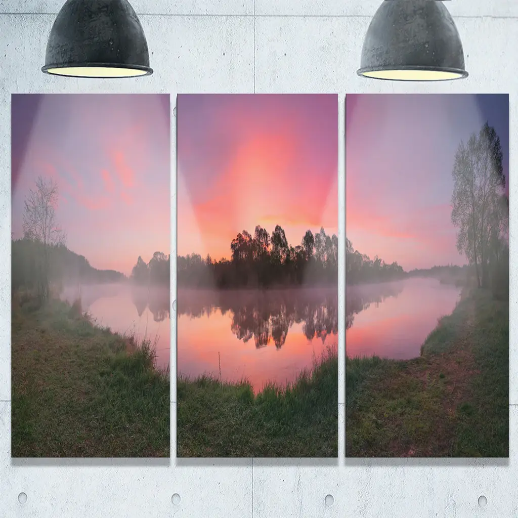 "Purple Tinged Lake Sunrise View" Metal Wall Art, 3 Panels, 36"x28"