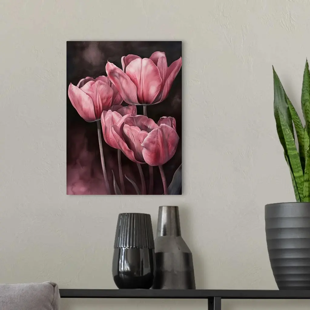 Vintage oil painting of three pink and red tulips on a dark background in the style of baroque, with dark moody lighting, high resolution, hyper realistic.