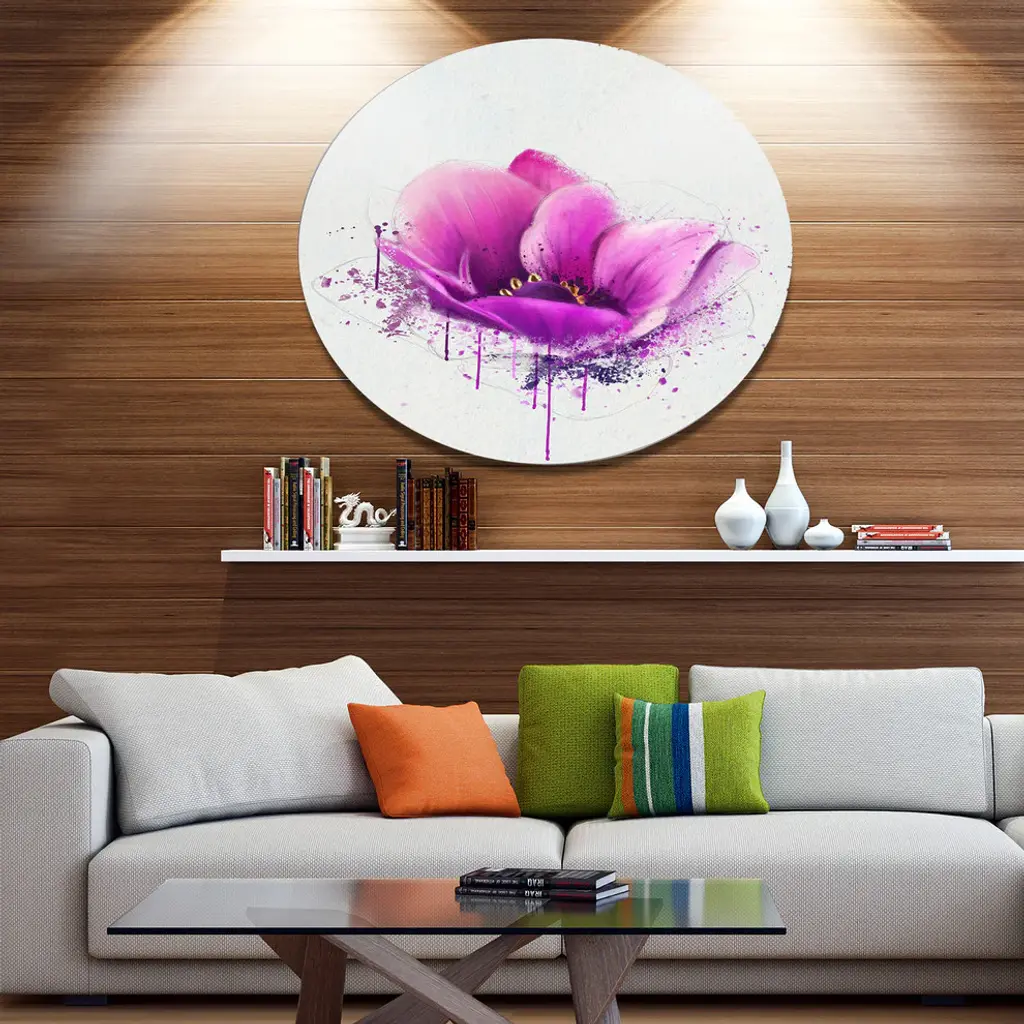 Bring Contemporary Abstraction to your home with this large Circle Metal wall art. This Purple Watercolor Poppy Flower Metal Artwork makes it the focal point of any room or office. - White Gloss Coating ensures colors are extra vibrant with light reflection.- Aluminum grade Sheet Metal with 1 inch mounting frame on the back giving the illusion that the artwork is floating on the wall..- Mounting Brackets are included along with instructions.- High Quality Digital images are created directly into a glossy aluminum panel producing a stunning and captivating print into the glossy finish of the metal.- Water, Fire and Scratch resistant HD Aluminum panels.- Looks better than any photo paper and guaranteed to last at least 20 years- Easy to clean with a microfiber cloth. Colors are far superior to regular Canvas Art. - Easy to Hang