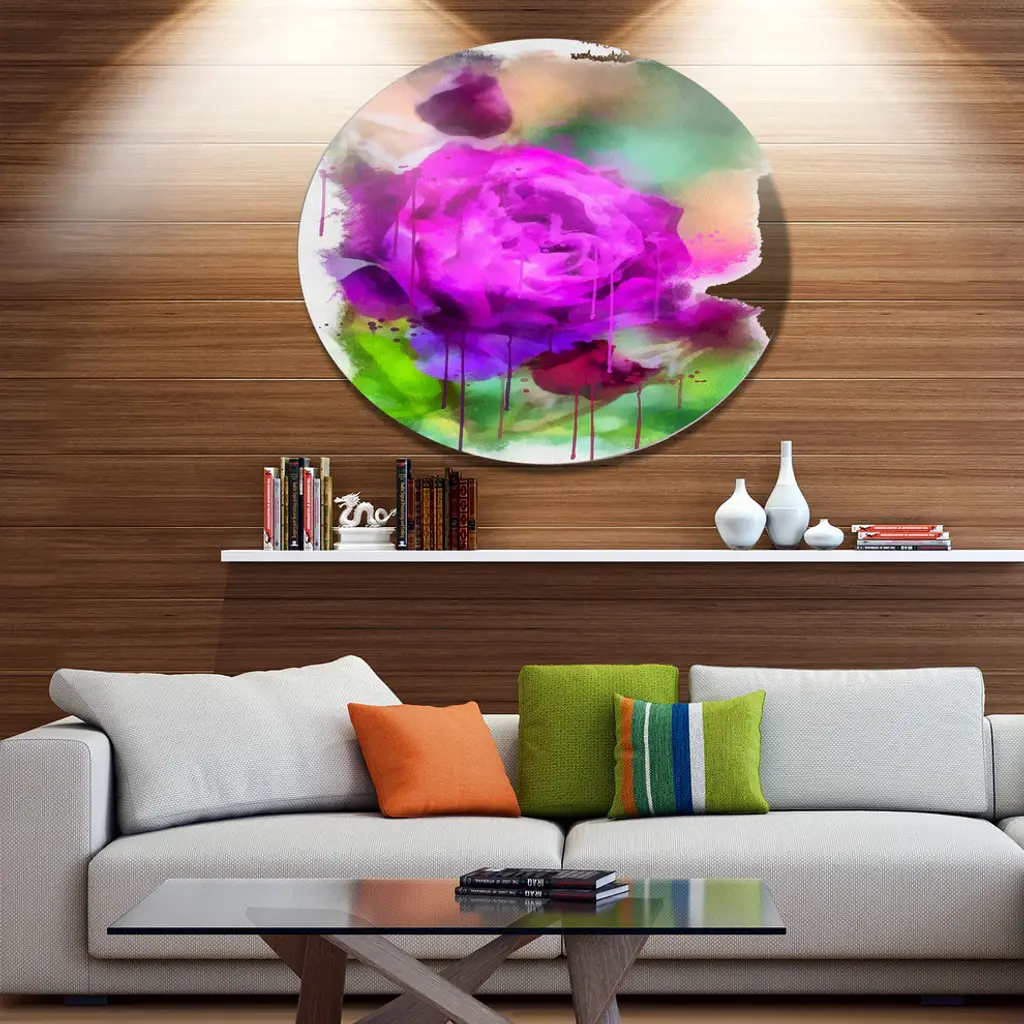 Bring Contemporary Abstraction to your home with this large Circle Metal wall art. This Purple Watercolor Rose Painting Metal Artwork makes it the focal point of any room or office. - White Gloss Coating ensures colors are extra vibrant with light reflection.- Aluminum grade Sheet Metal with 1 inch mounting frame on the back giving the illusion that the artwork is floating on the wall..- Mounting Brackets are included along with instructions.- High Quality Digital images are created directly into a glossy aluminum panel producing a stunning and captivating print into the glossy finish of the metal.- Water, Fire and Scratch resistant HD Aluminum panels.- Looks better than any photo paper and guaranteed to last at least 20 years- Easy to clean with a microfiber cloth. Colors are far superior to regular Canvas Art. - Easy to Hang