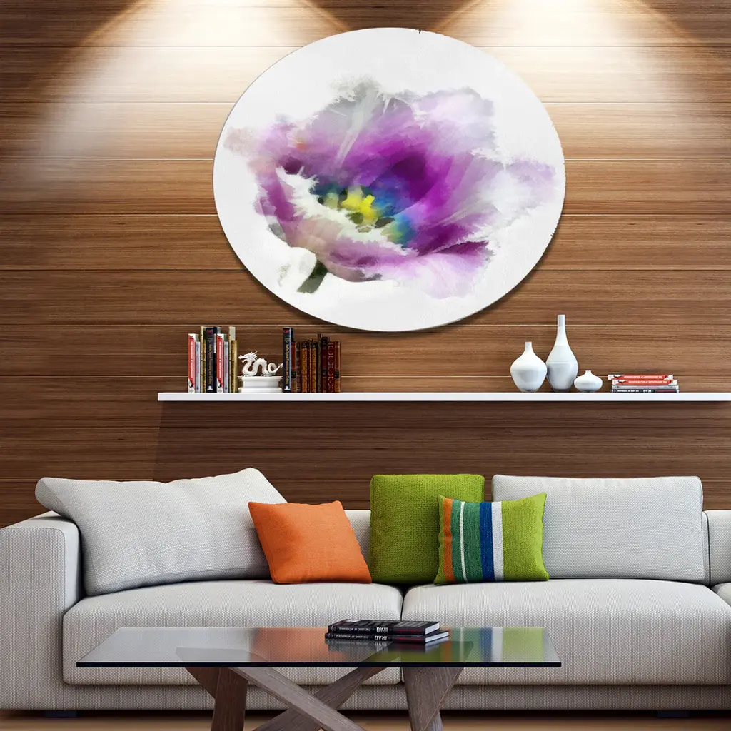 Bring Contemporary Abstraction to your home with this large Circle Metal wall art. This Purple Watercolor Tulip Flower Metal Artwork makes it the focal point of any room or office. - White Gloss Coating ensures colors are extra vibrant with light reflection.- Aluminum grade Sheet Metal with 1 inch mounting frame on the back giving the illusion that the artwork is floating on the wall..- Mounting Brackets are included along with instructions.- High Quality Digital images are created directly into a glossy aluminum panel producing a stunning and captivating print into the glossy finish of the metal.- Water, Fire and Scratch resistant HD Aluminum panels.- Looks better than any photo paper and guaranteed to last at least 20 years- Easy to clean with a microfiber cloth. Colors are far superior to regular Canvas Art. - Easy to Hang