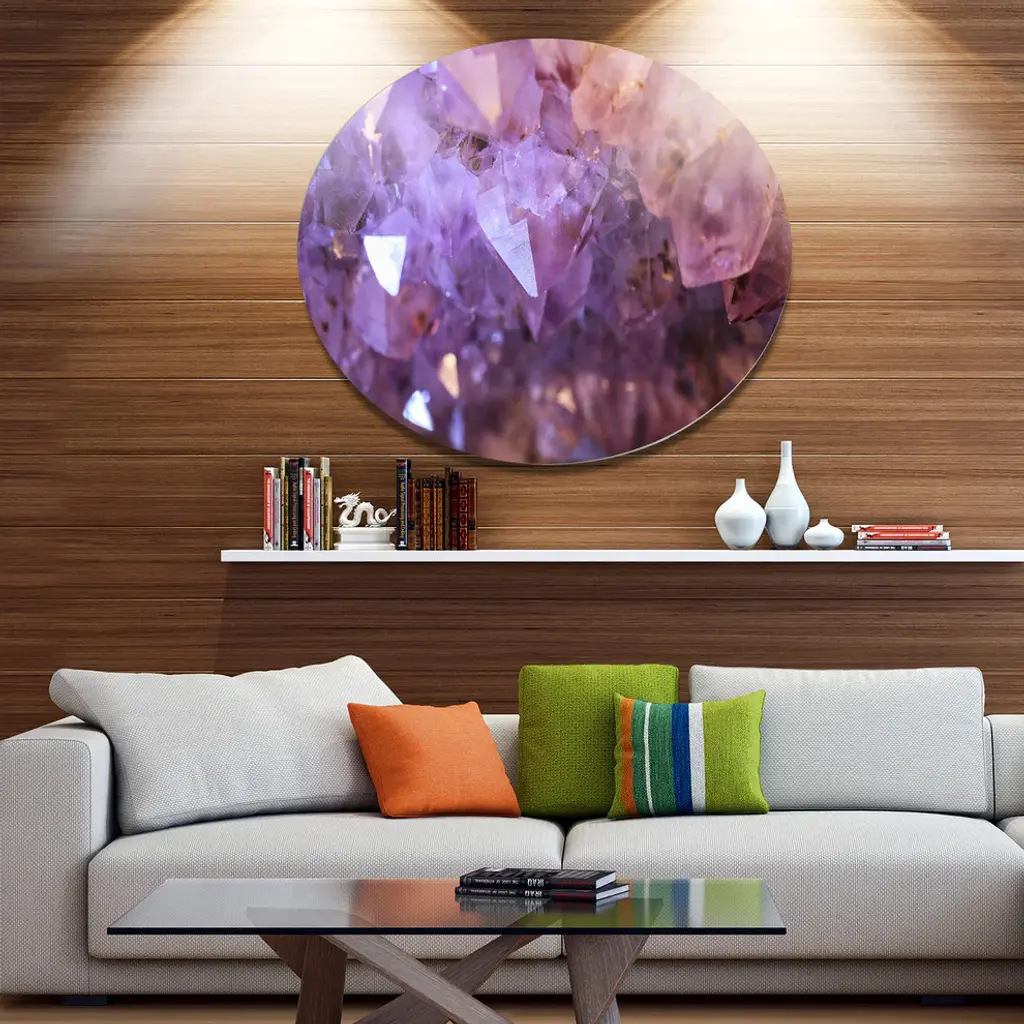 Bring Contemporary Abstraction to your home with this large Circle Metal wall art. This Purple White Natural Amethyst Geode Metal Artwork makes it the focal point of any room or office. - White Gloss Coating ensures colors are extra vibrant with light reflection.- Aluminum grade Sheet Metal with 1 inch mounting frame on the back giving the illusion that the artwork is floating on the wall..- Mounting Brackets are included along with instructions.- High Quality Digital images are created directly into a glossy aluminum panel producing a stunning and captivating print into the glossy finish of the metal.- Water, Fire and Scratch resistant HD Aluminum panels.- Looks better than any photo paper and guaranteed to last at least 20 years- Easy to clean with a microfiber cloth. Colors are far superior to regular Canvas Art. - Easy to Hang