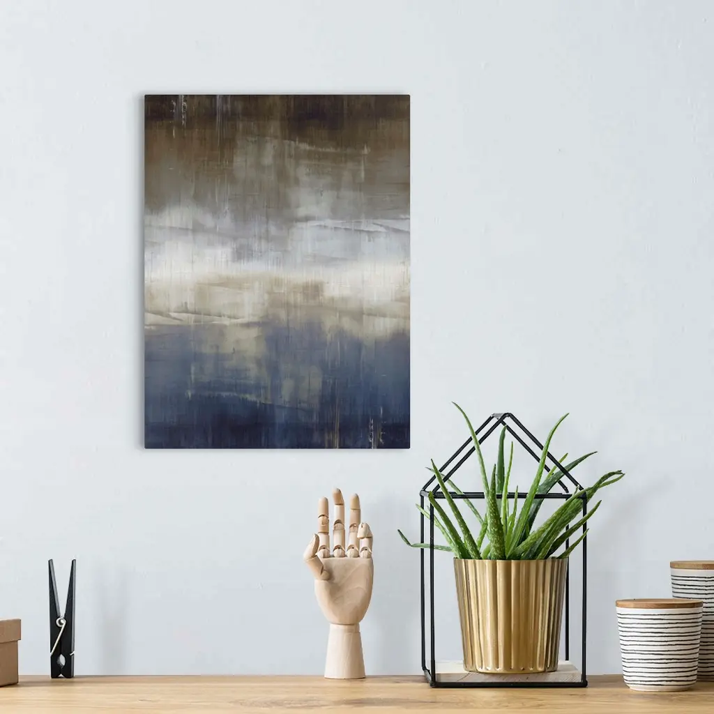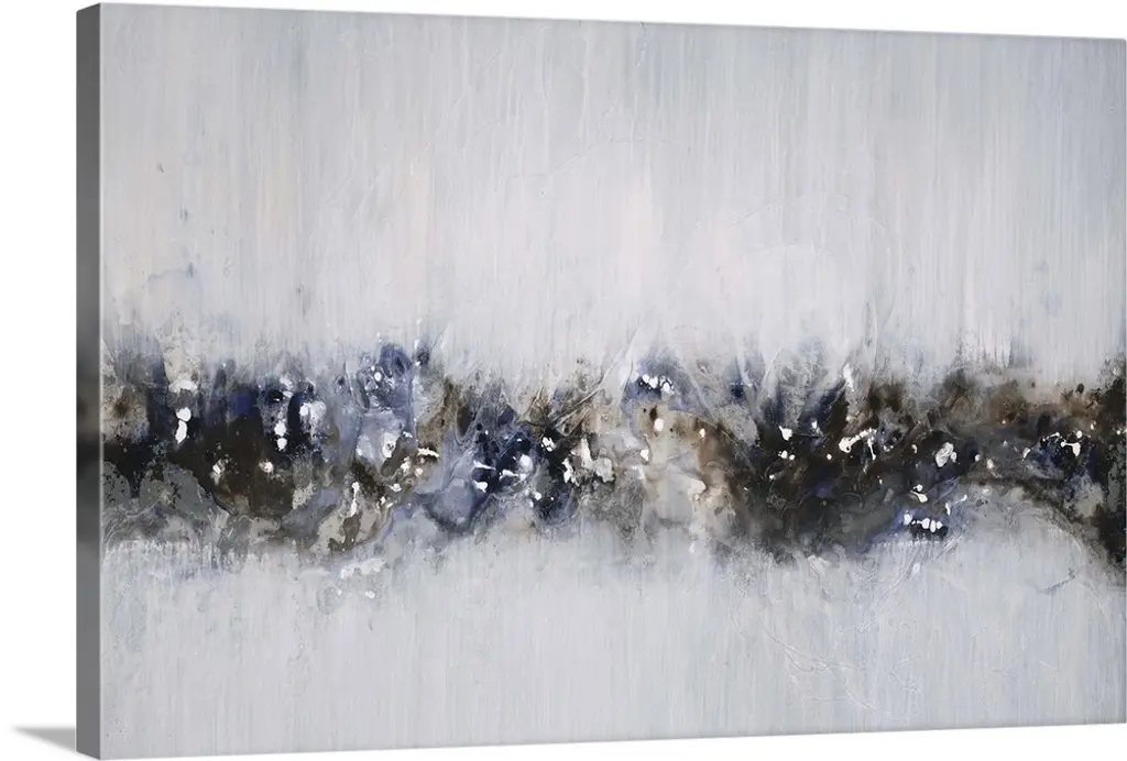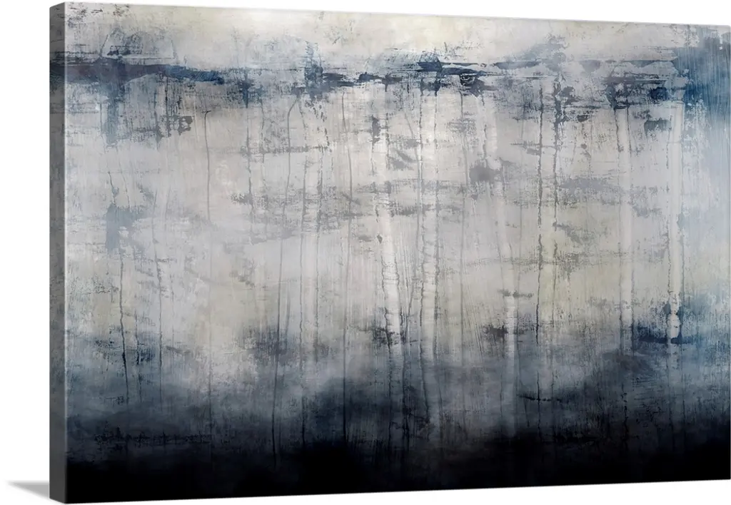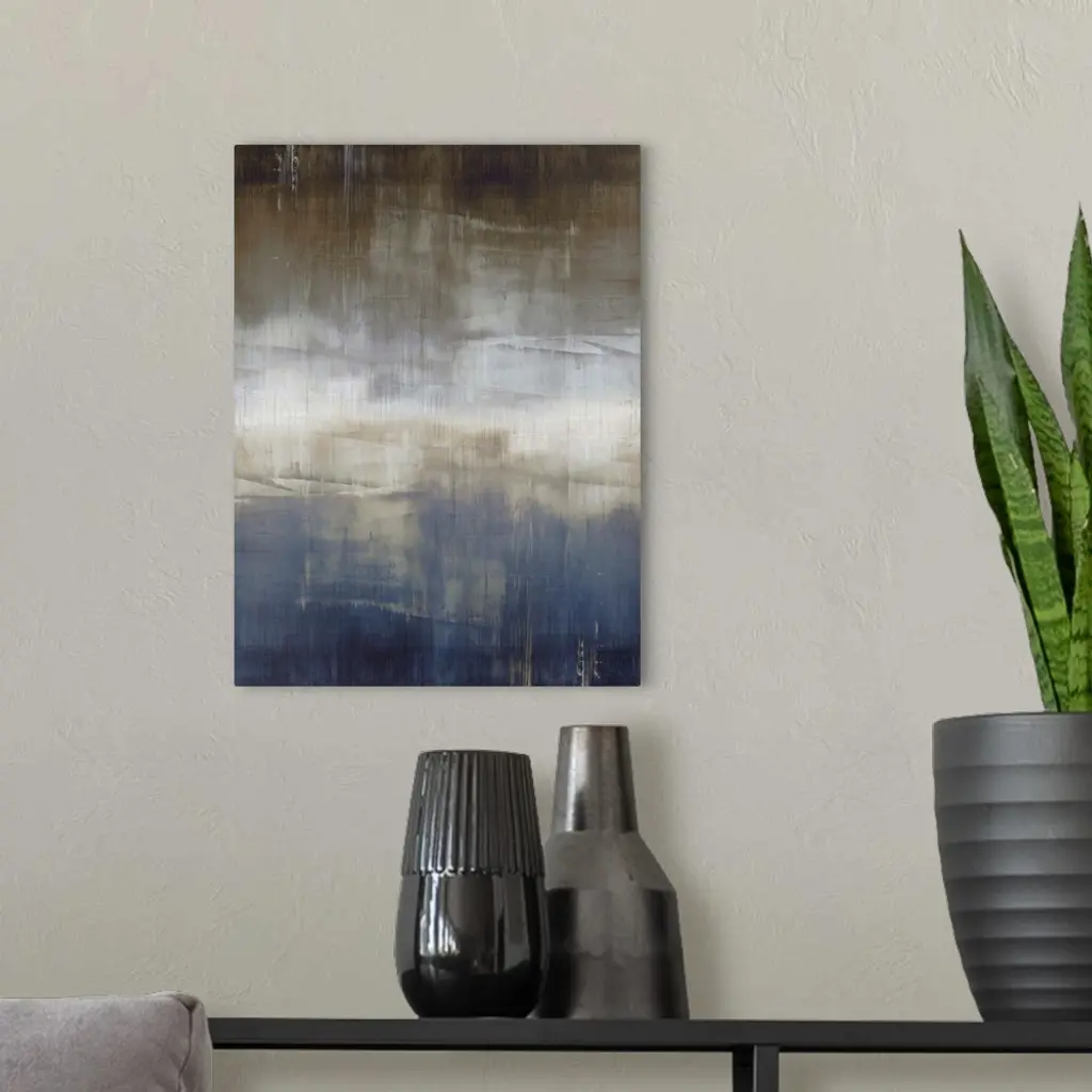 Abstract artwork of vertical brush strokes in blue, white and brown with visible horizontal lines throughout.
