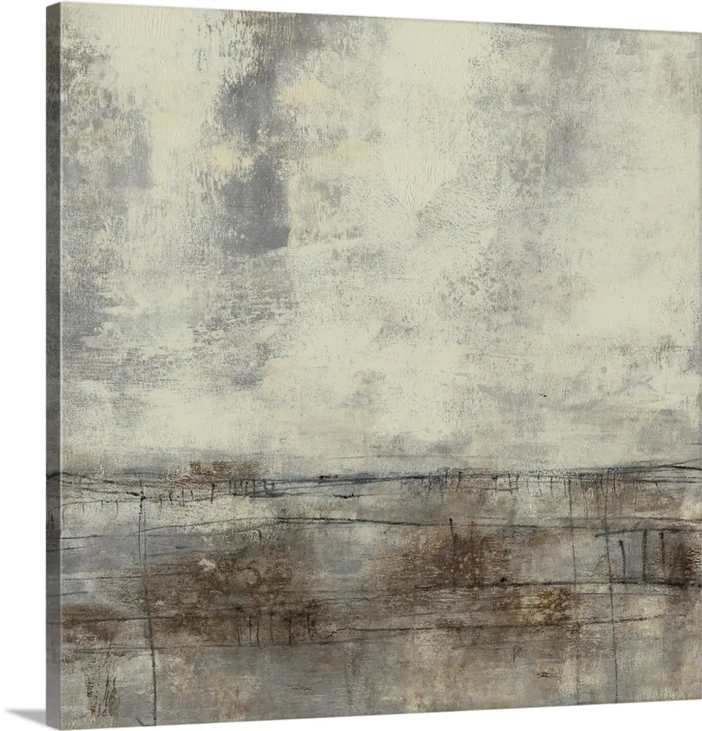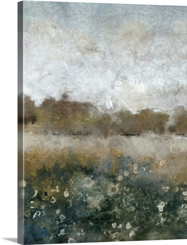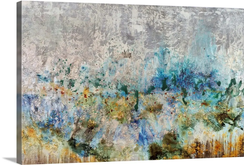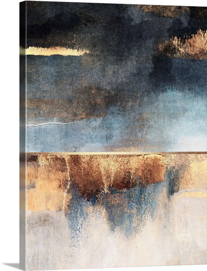 Abstract artwork of vertical brush strokes in blue, white and brown with visible horizontal lines throughout.