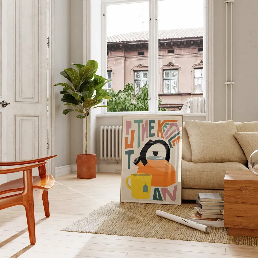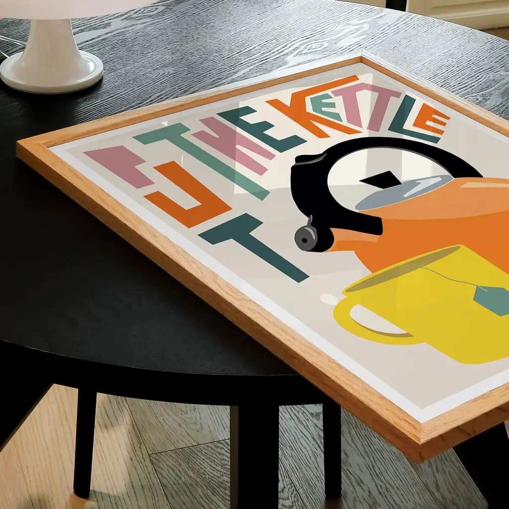 'Put the Kettle On' Print - A3 sizeA charming and nostalgic addition to your kitchen or dining area. Embrace the cozy atmosphere and make a statement with this delightful artwork that celebrates the simple joys of sharing a cuppa. All prints are digitally designed by myself and printed to order.Smooth fine art 230 gsm matte card. Printed with vivid colour and detail. Sold without a frame.