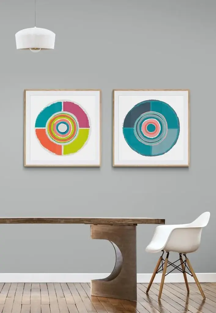 This colorful, mid century inspired fine art print is digitally printed on premium white matte paper. While sold individually, coordinating prints by Melinda Cox, Creative Director of Balanced Design Studio, are available in additional colorways to combine as pairs or groupings of bold color. The print " Circles in Coral and Teal" was designed as a companion to this piece. Using the highest quality printing available, these prints have superb color saturation. Made to order, the prints are shipped unframed in a tube and are available in four sizes. Each print is hand signed by Melinda Cox. About the artist: Melinda Cox is the Creative Director of Balanced Design: Modern Patterns / Traditional Craftsmanship/ Made in the USA fabrics, rugs and fine art prints. An artist at the intersection of minimalism and graphic pattern, her work can be seen in both commercial projects and private residences throughout the USA and has appeared in numerous national and international publications. Her fine art prints are represented by Candita Clayton Gallery. Artist Statement: I see the world in simple shapes and powerful colors. I see patterns. Whether as a print designer, a graphic designer, a textile designer, or a rug designer, I take a minimalist approach to using color, shape and form. My work has been called daring, bold, whimsical and happy, and is inspired by any simple shape, like a bird’s foot imprinted in the sand.
