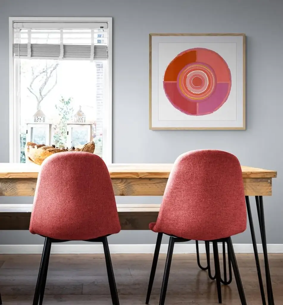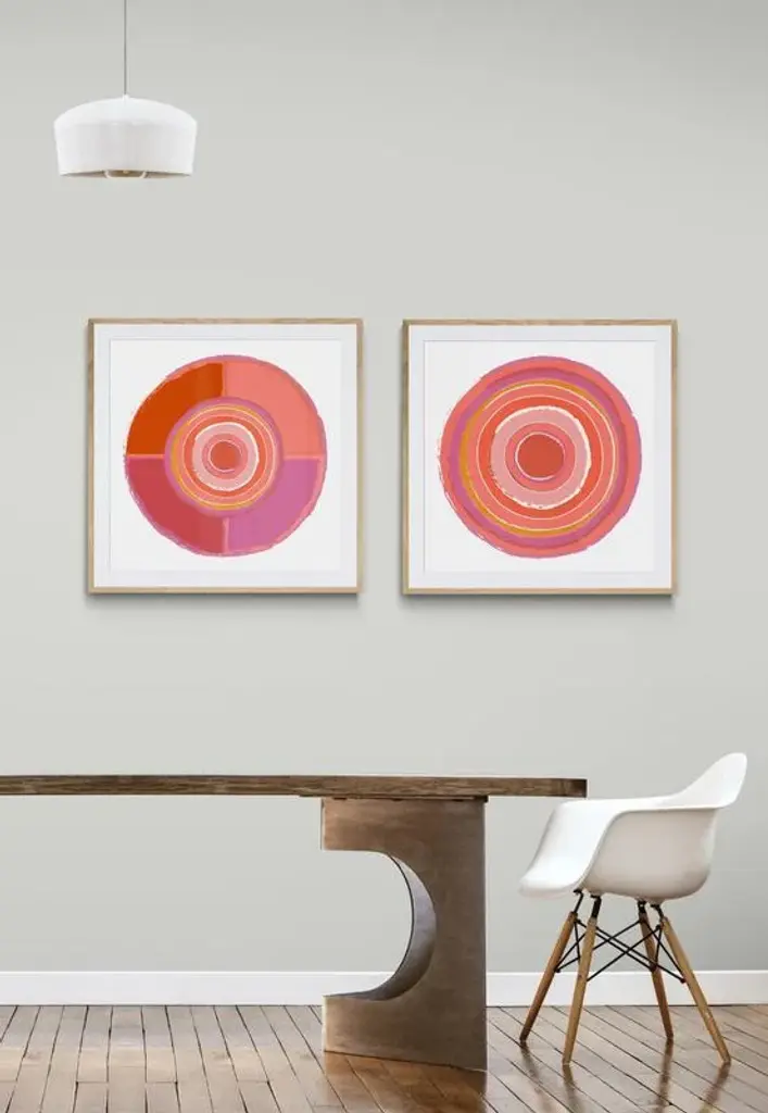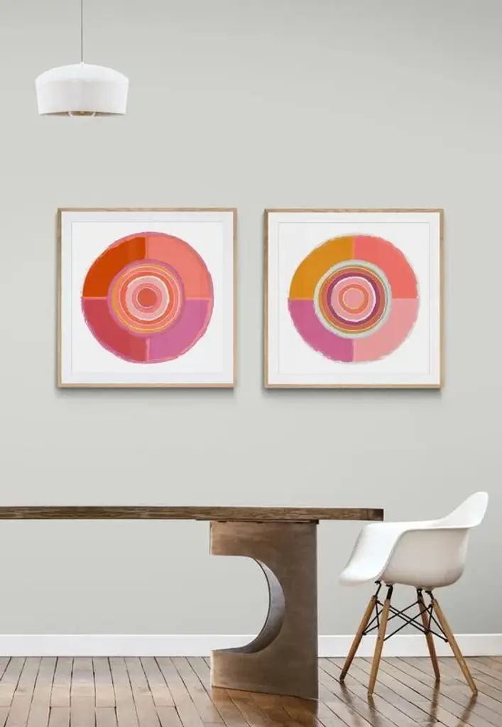 This colorful, mid century inspired fine art print is digitally printed on premium white matte paper. While sold individually, coordinating prints by Melinda Cox, Creative Director of Balanced Design Studio, are available in additional colorways to combine as pairs or groupings of bold color. The print "Circles in Red" was designed as a companion to this piece. Using the highest quality printing available, these prints have superb color saturation. Made to order, the prints are shipped unframed in a tube and are available in four sizes. Each print is hand signed by Melinda Cox. About the artist: Melinda Cox is the Creative Director of Balanced Design: Modern Patterns / Traditional Craftsmanship/ Made in the USA fabrics, rugs and fine art prints. An artist at the intersection of minimalism and graphic pattern, her work can be seen in both commercial projects and private residences throughout the USA and has appeared in numerous national and international publications. Her fine art prints are represented by Candita Clayton Gallery. Artist Statement: I see the world in simple shapes and powerful colors. I see patterns. Whether as a print designer, a graphic designer, a textile designer, or a rug designer, I take a minimalist approach to using color, shape and form. My work has been called daring, bold, whimsical and happy, and is inspired by any simple shape, like a bird’s foot imprinted in the sand.