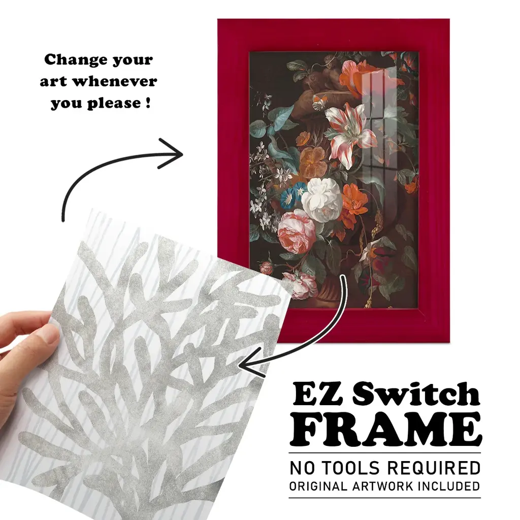 Quiet Coral III -EZ SWITCH Framed Print w/glass-Cherry Red A delightful, framed print. Featuring a solid wood frame with real wood glass. This premium print is giclee quality. In addition, every frame features a removable back and table top stand. This allows you to change your art in the future or to just stand the art on a table for a new look. We are sure you'll enjoy our new series of EZ SWITCH Framed Art. Solid Wood Frame Real Glass Removable / Replaceable Art Built in Tabletop Stand Sizes range from 4x6 up to 12x15 - buy just one or pair them up as sets as you see fit.