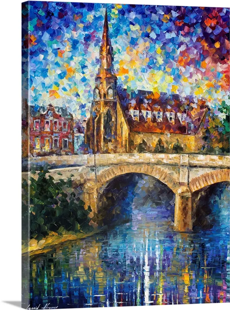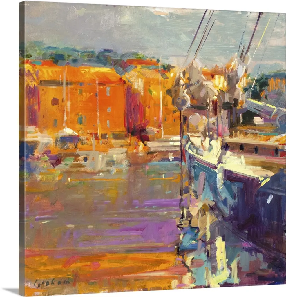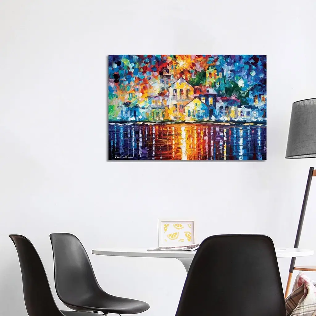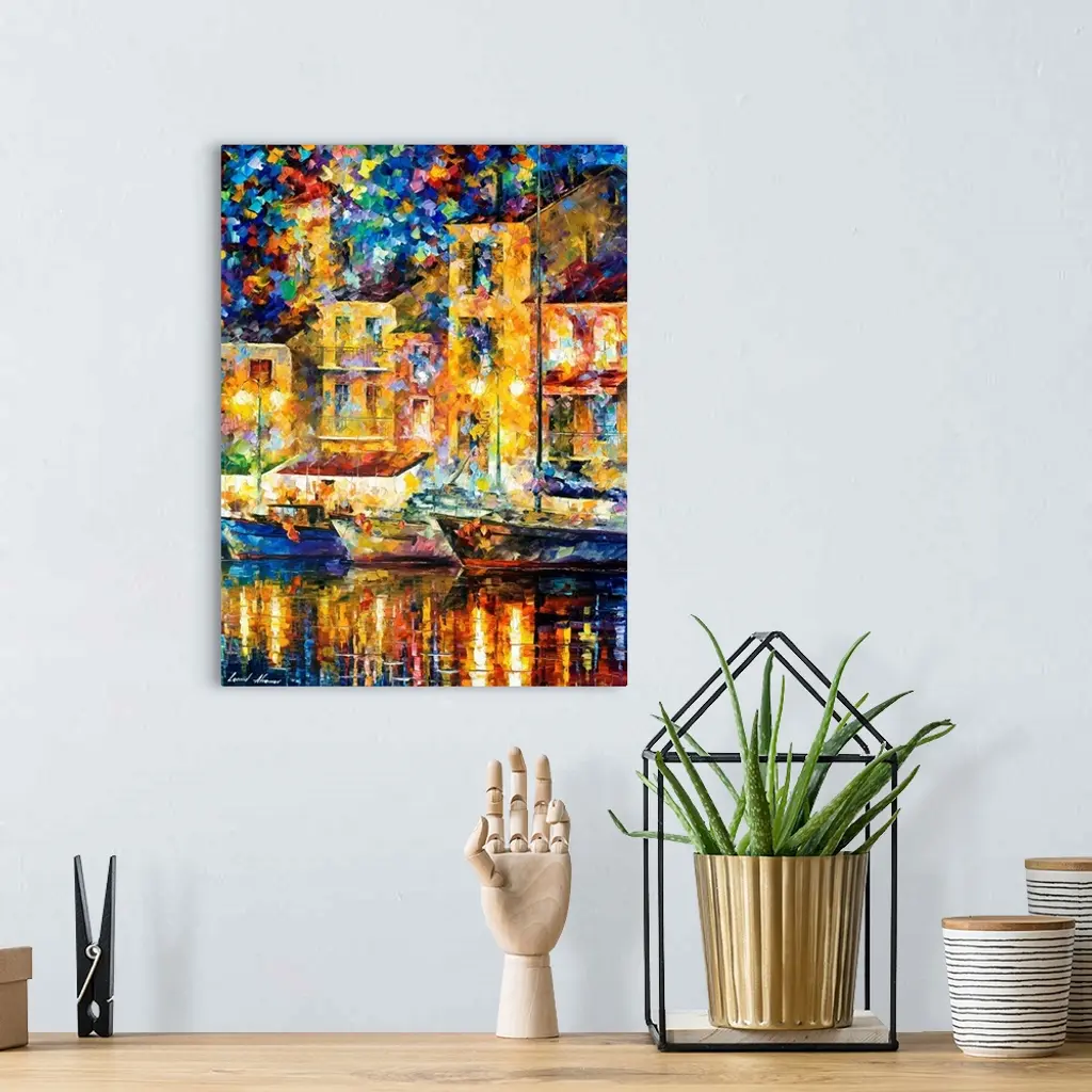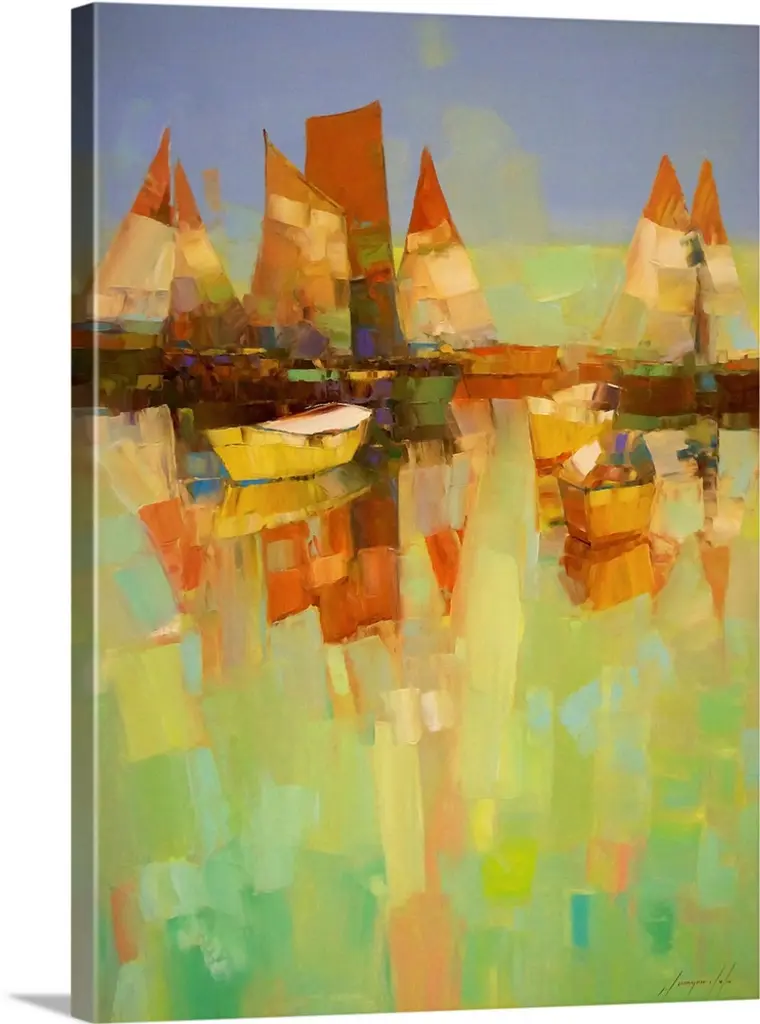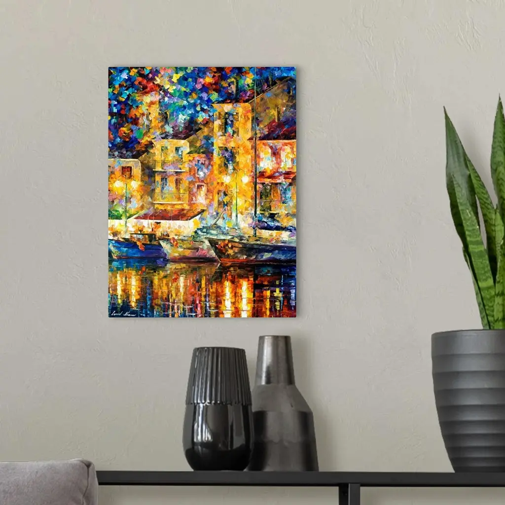 Contemporary colorful painting of an urban harbor with boats resting while the sun sets.