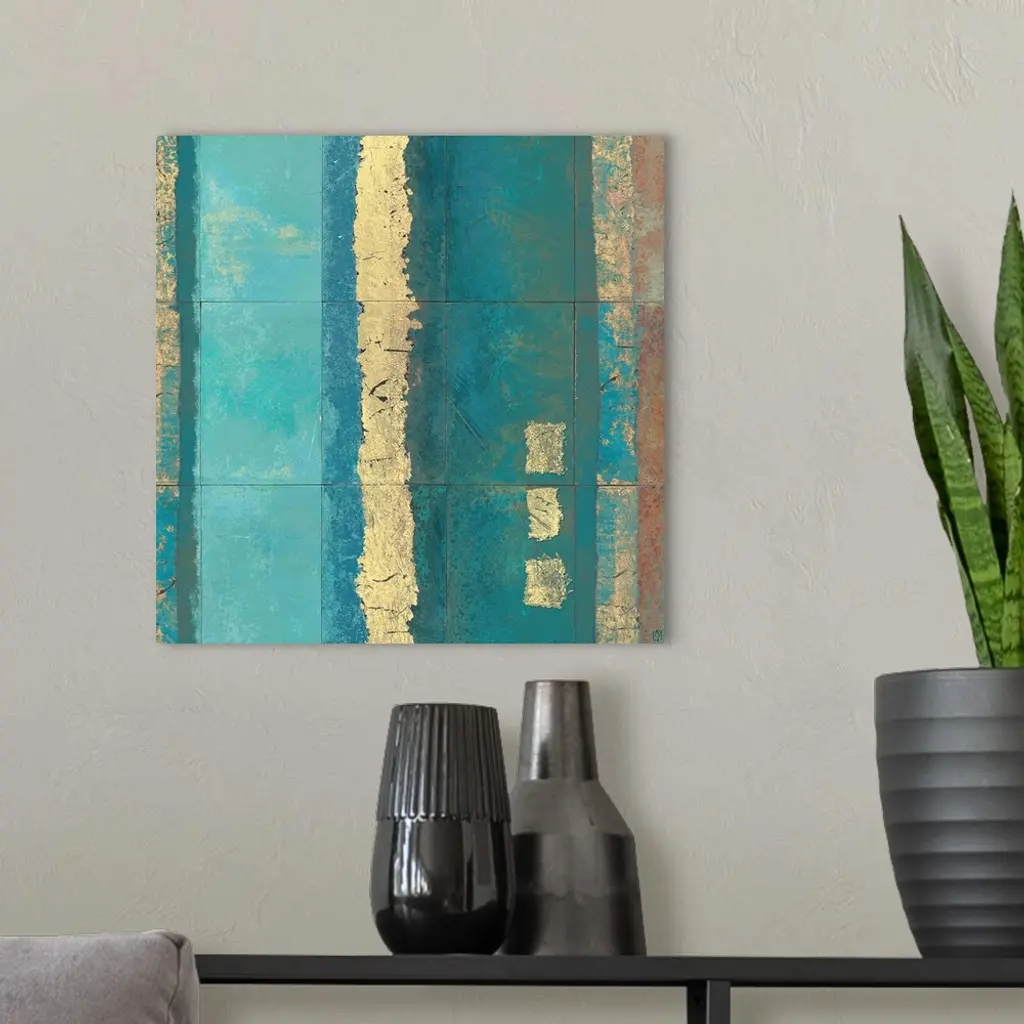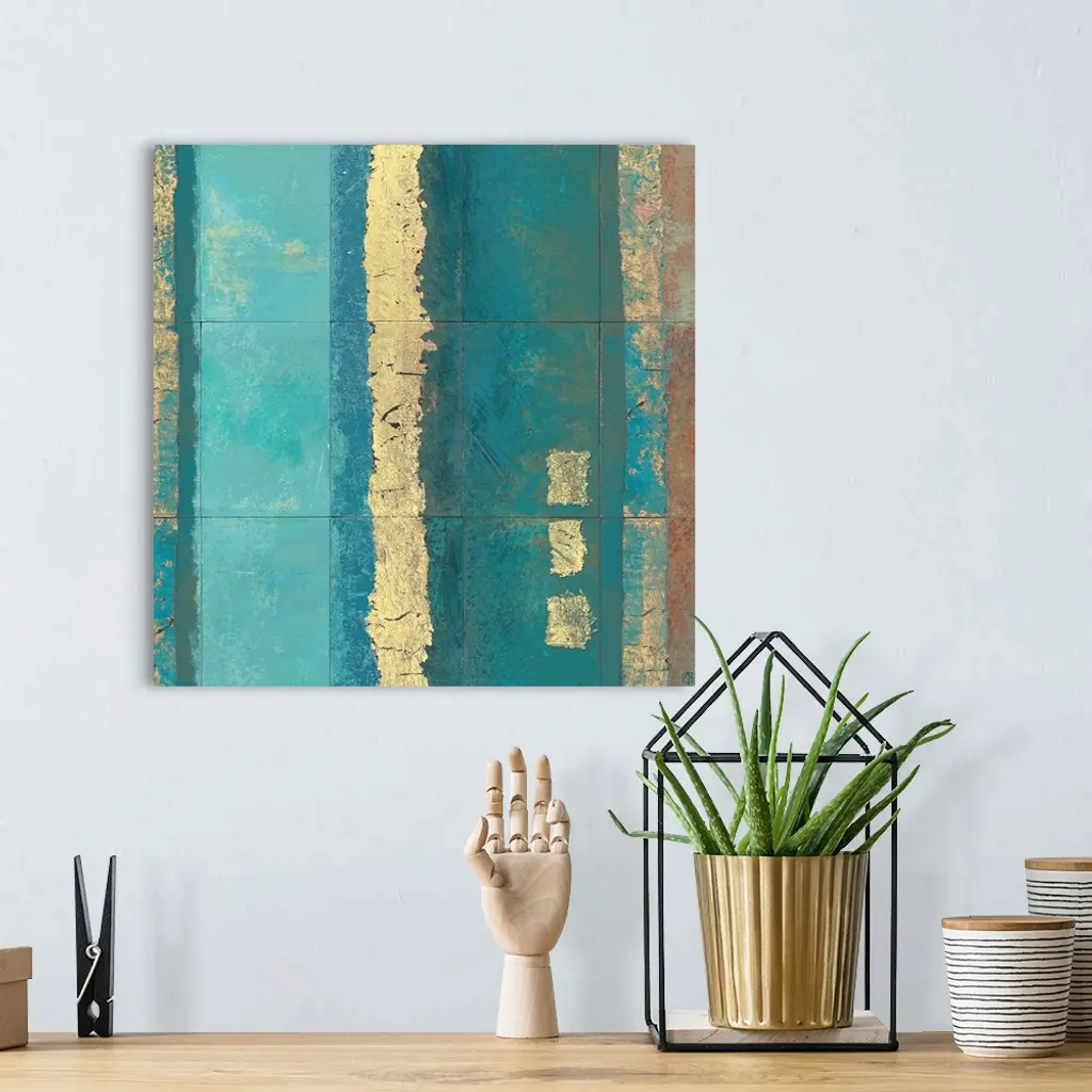 This gicloe print of a contemporary mixed media painting made with tiles that have been painted with stripes of color then sanded down.