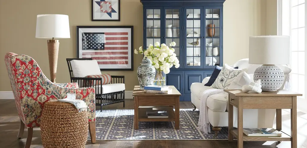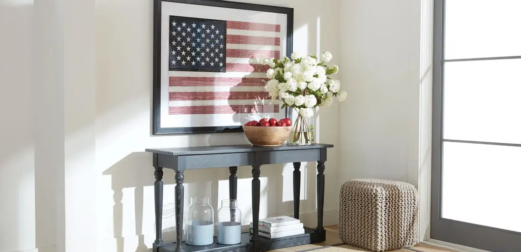 American handcrafting continues to evolve gloriously. In tribute to her grandmother's quilt collection, artist Dawn Wolfe renders the stars and stripes in a hand-cut appliqué collage rich in detail and patriotic pride. Tradition stands, with a fresh perspective of artistic horizons.