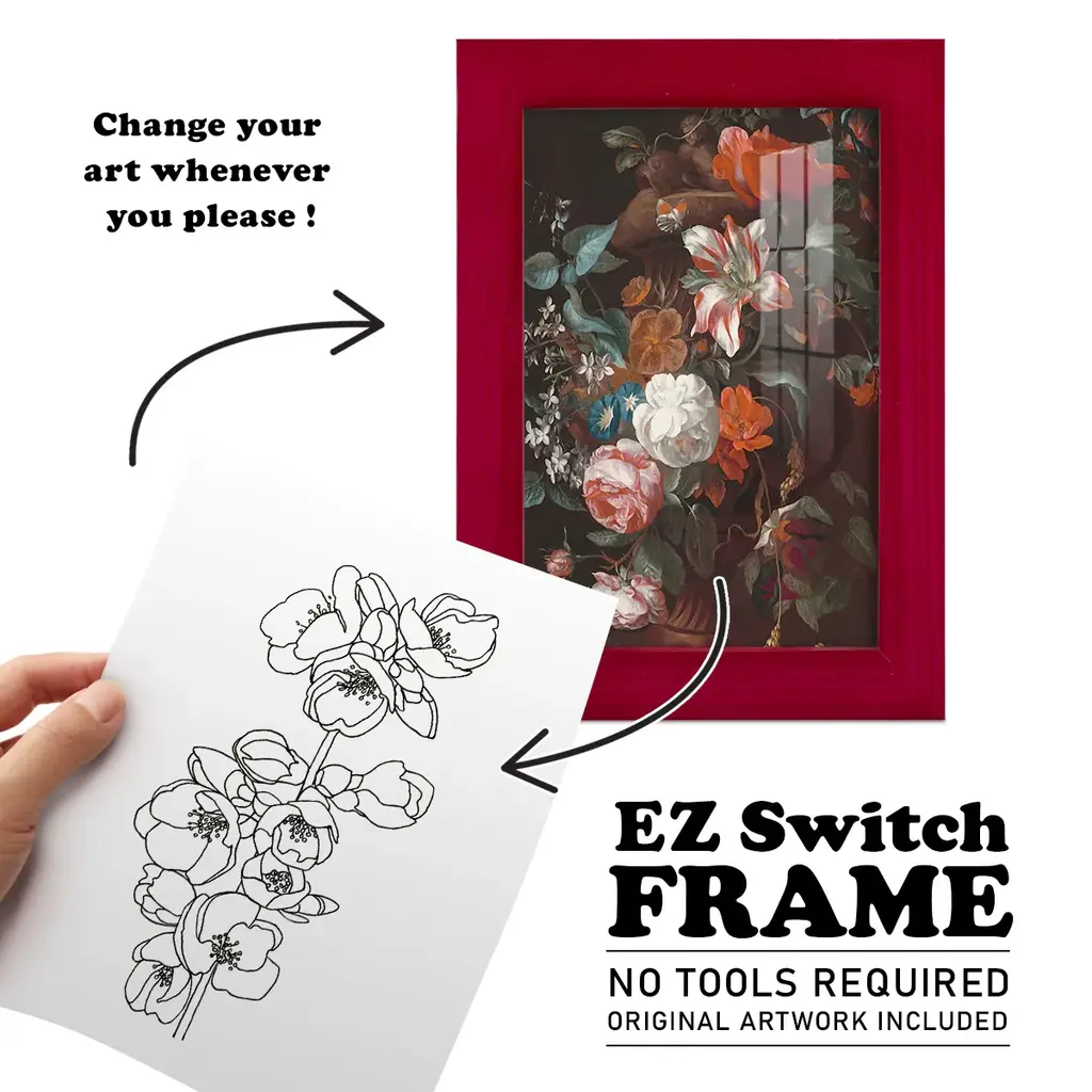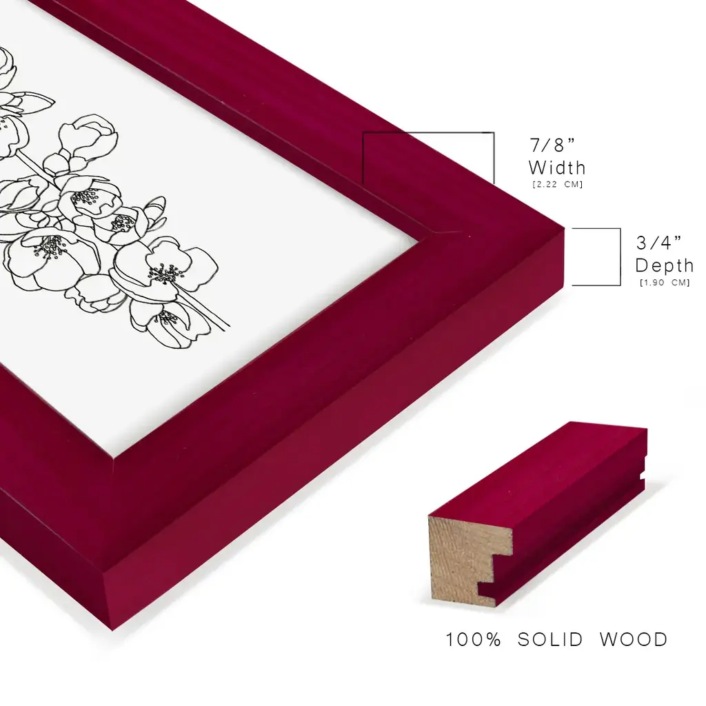 Quince Blossom Contour II -EZ SWITCH Framed Print w/glass-Cherry Red A delightful, framed print. Featuring a solid wood frame with real wood glass. This premium print is giclee quality. In addition, every frame features a removable back and table top stand. This allows you to change your art in the future or to just stand the art on a table for a new look. We are sure you'll enjoy our new series of EZ SWITCH Framed Art. Solid Wood Frame Real Glass Removable / Replaceable Art Built in Tabletop Stand Sizes range from 4x6 up to 12x15 - buy just one or pair them up as sets as you see fit.
