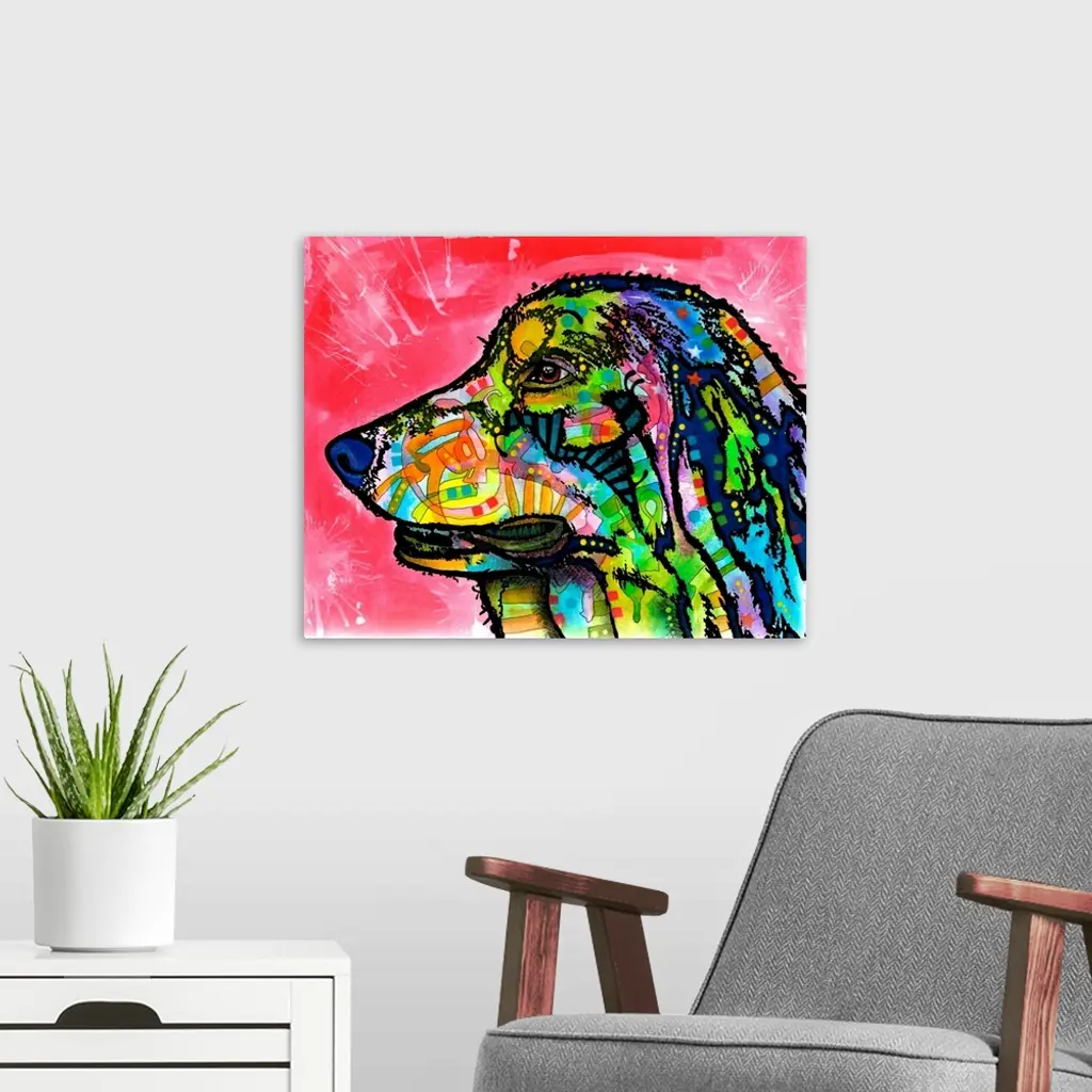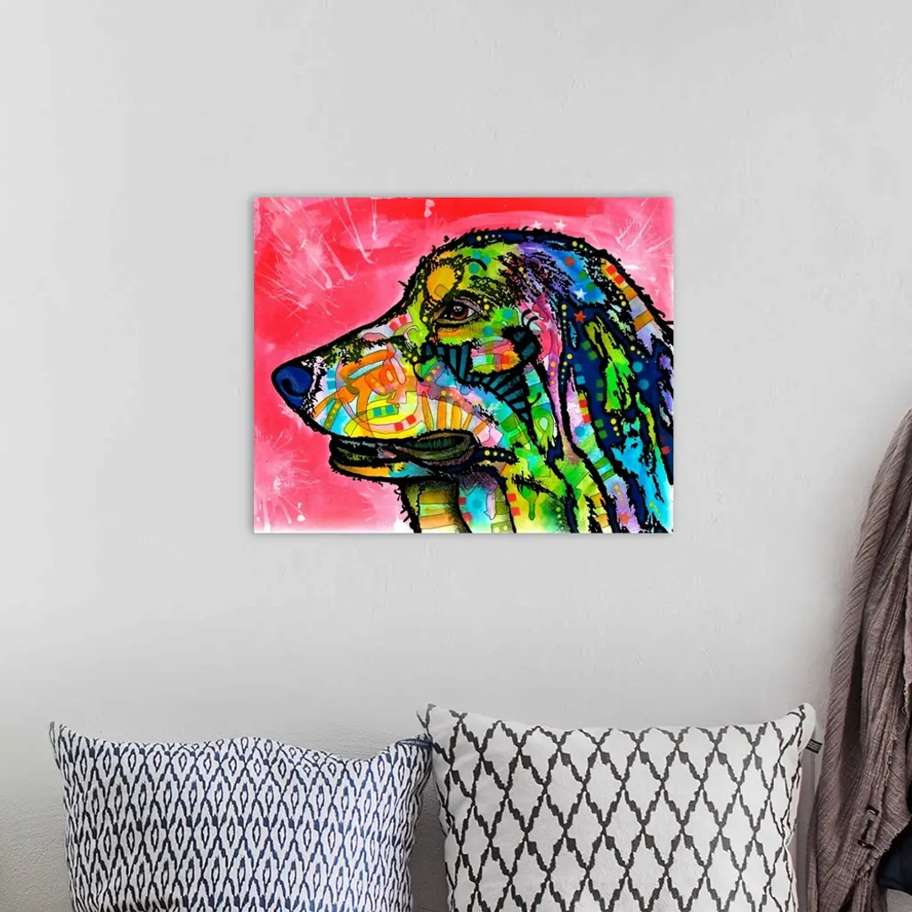 Contemporary stencil painting of a dog filled with various colors and patterns.