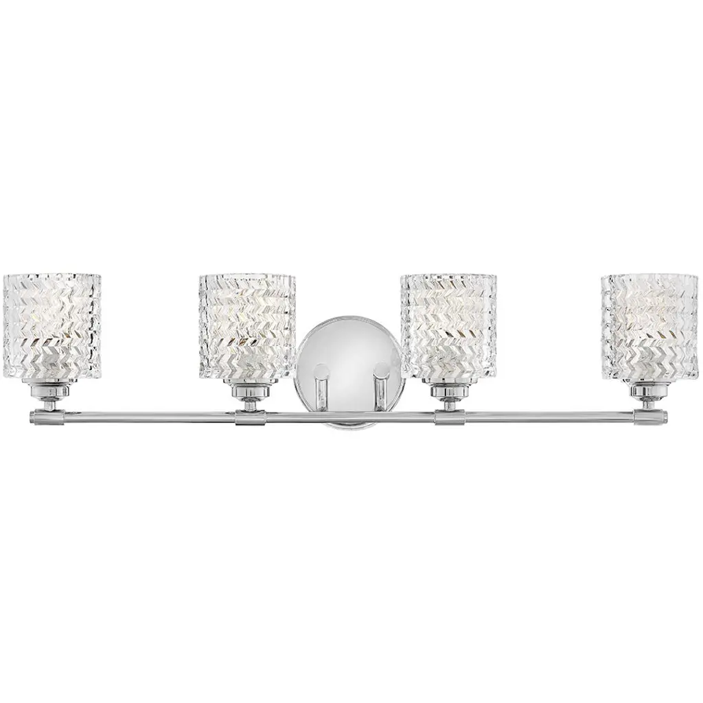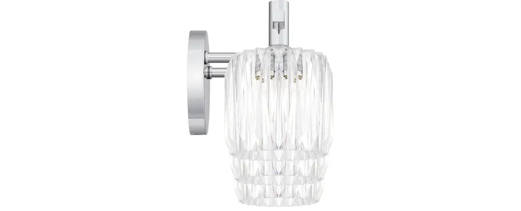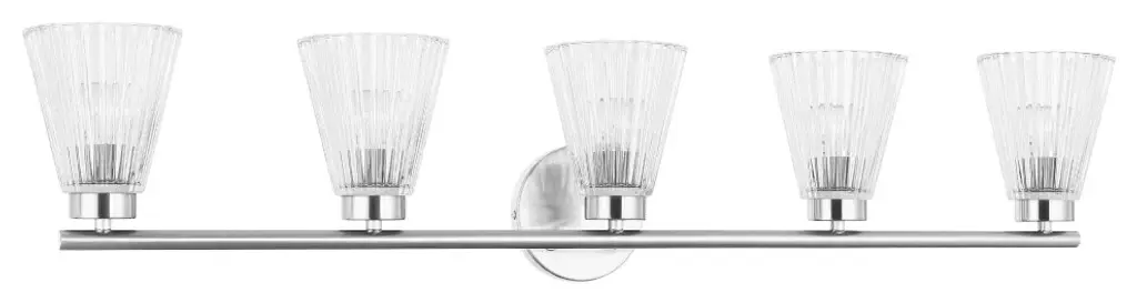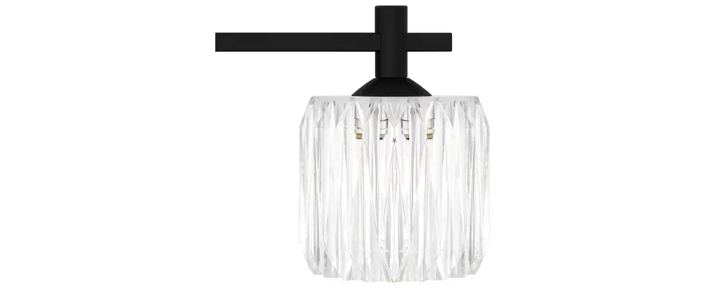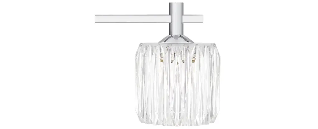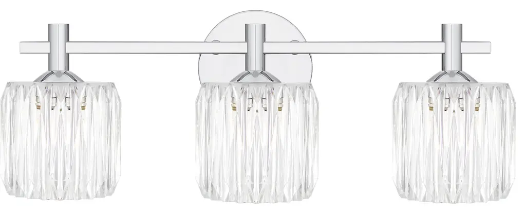 Features: Constructed from steel Includes clear ribbed acrylic shades Requires (3) G9 10 watt bulbs (not included) Capable of being dimmed Can be mounted to provide up or down lighting ETL listed for damp locations Covered by Quoizel's 1 year limited manufacturer warranty Dimensions: Height: 7-3/4" Width: 21-1/2" Extension: 5-1/2" Product Weight: 5.54 lbs Shade Height: 4-1/2" Shade Width: 5" Backplate Height: 5" Backplate Width: 5" Backplate Depth: 3/4" Electrical Specifications: Max Wattage: 30 watts Number of Bulbs: 3 Watts Per Bulb: 10 watts Bulb Base: G9 Voltage: 120 volts Bulbs Included: No