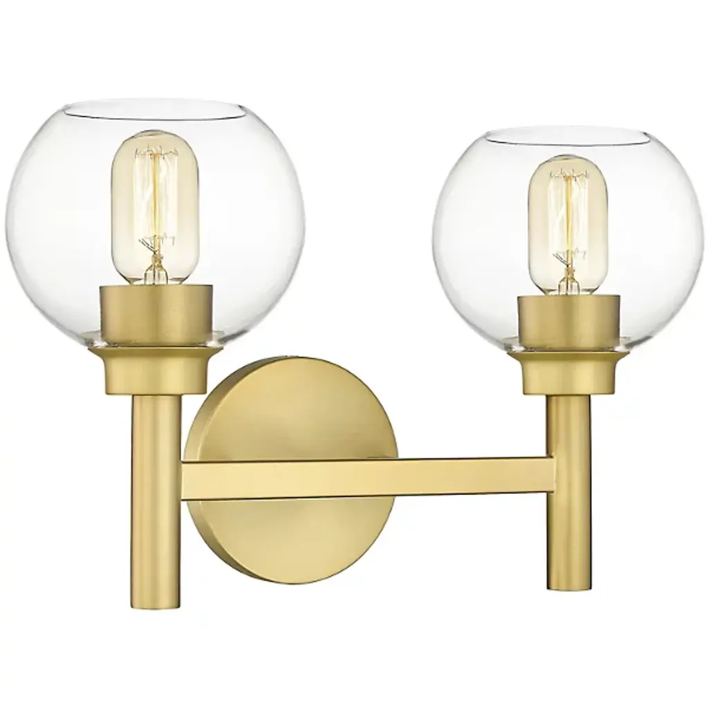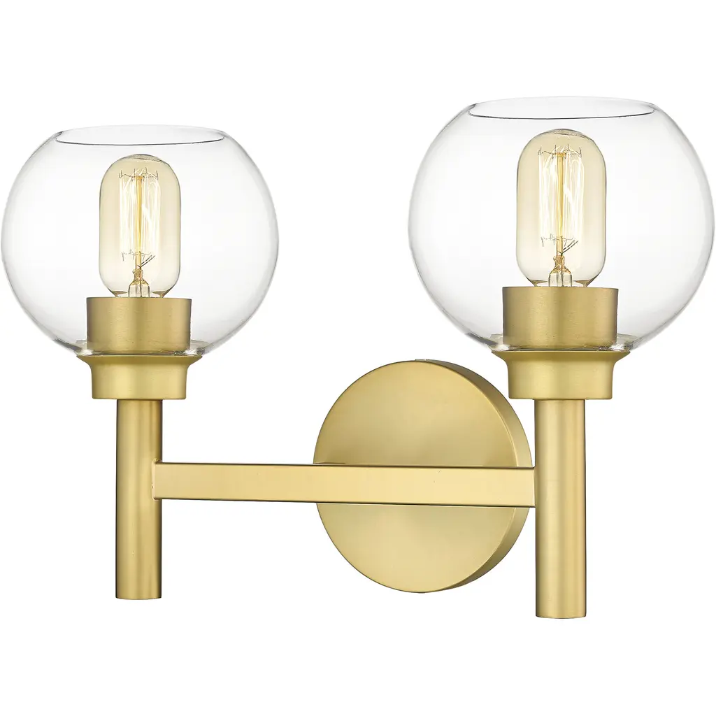 Quorum 578-2-80 2-Light Vanity Light, Aged Brass. Product Style: Soft Contemporary. Finish: Aged Brass. Dimension(in): 9.75(H) x 14.75(W) x 8.5(Ext). Bulb: (2)100W MediumBase(Not Included). Diffuser Material: Glass. Shade Color: Clear. UL Type: Damp.