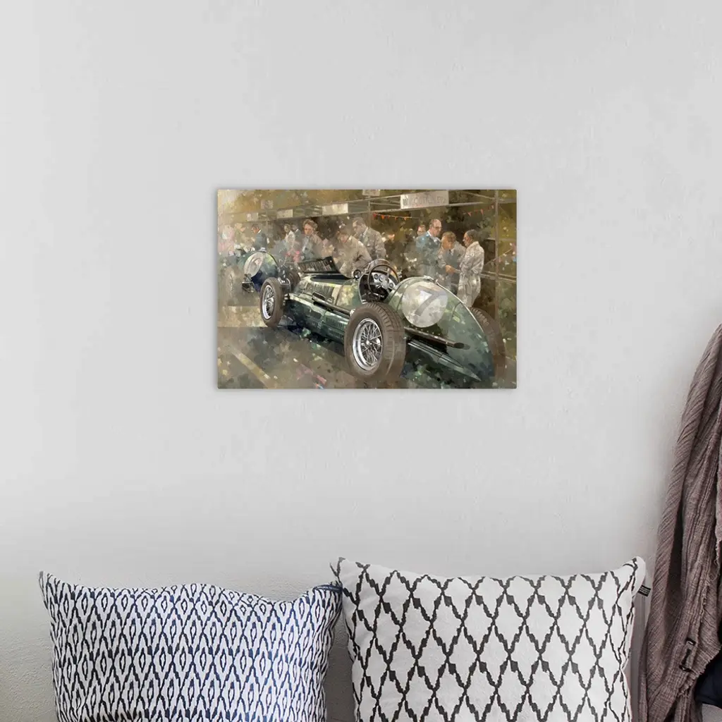 This painting wall art is a painting of a vintage Italian race car surrounded by spectators at a race in period clothing.