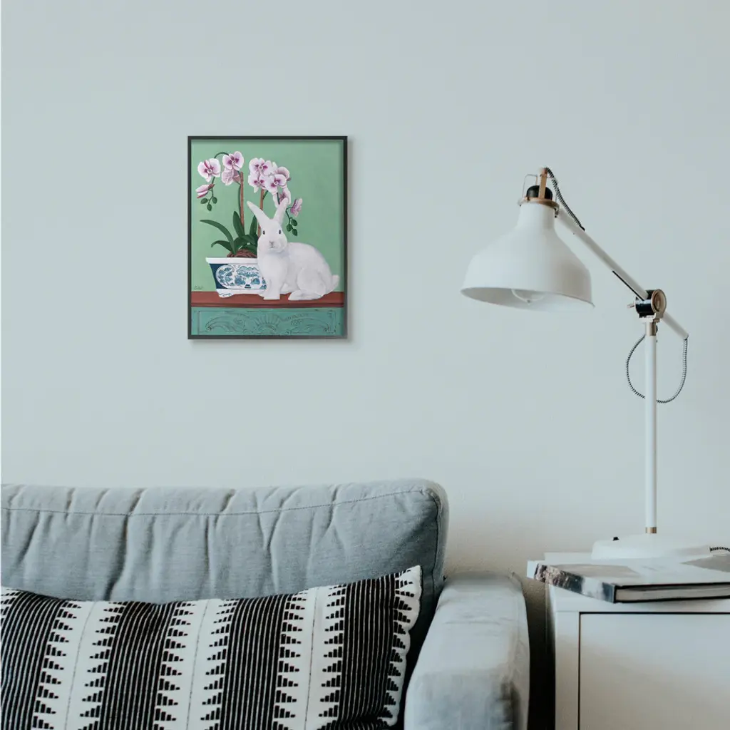 Rabbit And Flowers Pink Green Animal Painting, 11"x14"