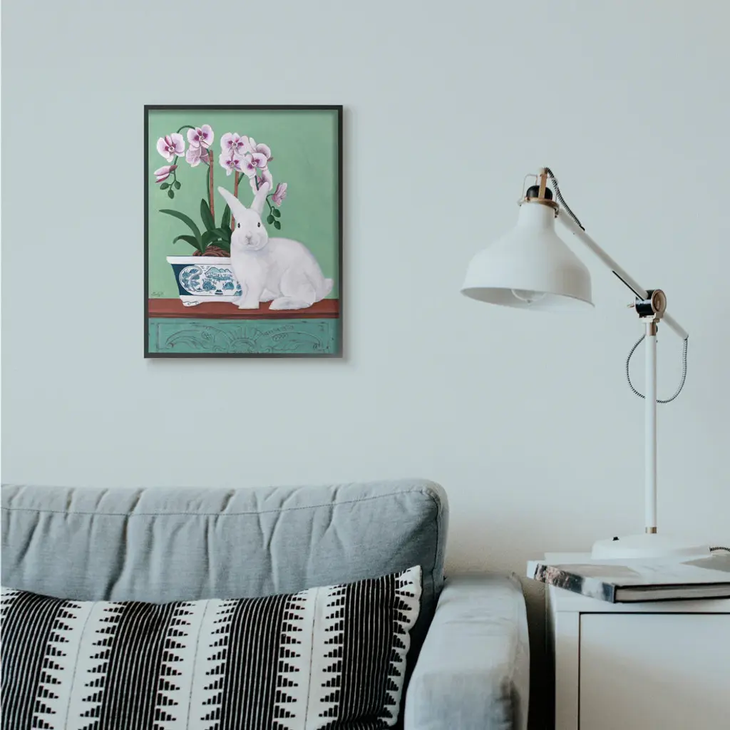 Rabbit And Flowers Pink Green Animal Painting, 16"x20"