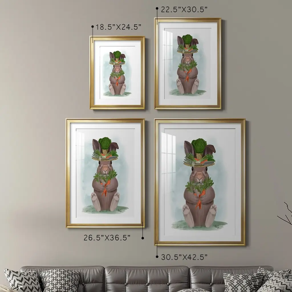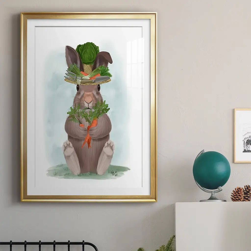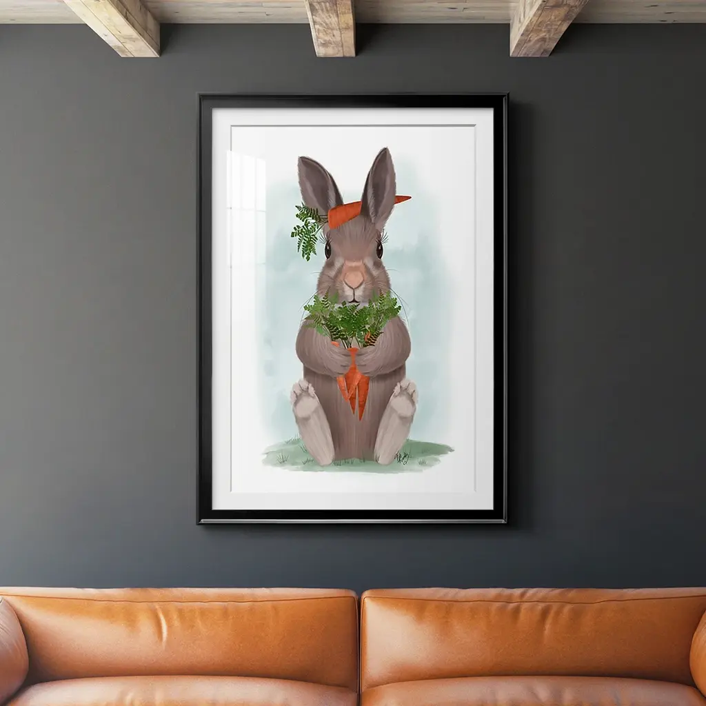 Rabbit Carrot Hat Premium Framed Print - Ready to Hang A Premium Framed Print created to last. Framed in distressed wood and available in an array of sizes and colors Featuring a beveled a solid wood stretcher bar, each piece comes ready to hand 4 SIZES AVAILABLE 30.5''X42.5'' - Overall Size 26.5'X36.5'' - Overall Size 22.5''x30.5'' - Overall Size 18.5''x24.5'' - Overall Size Each piece is made to order. Each piece comes with hanging hardware. Made in the USA Ready to Hang Giclee Paper Print Acrylic Glass Beveled Matt Board