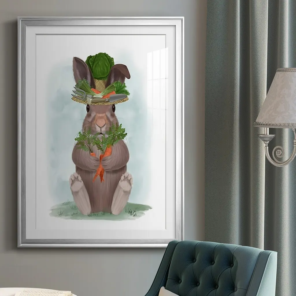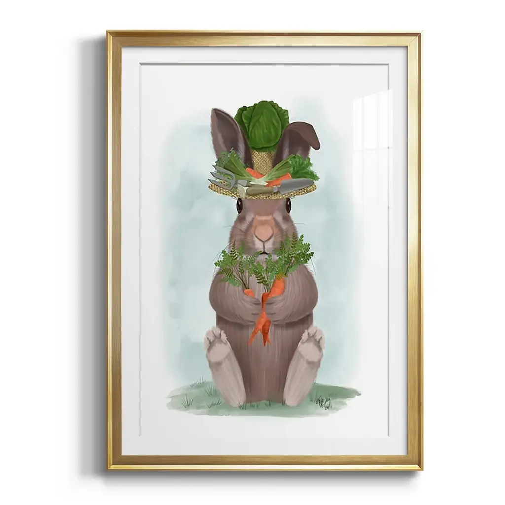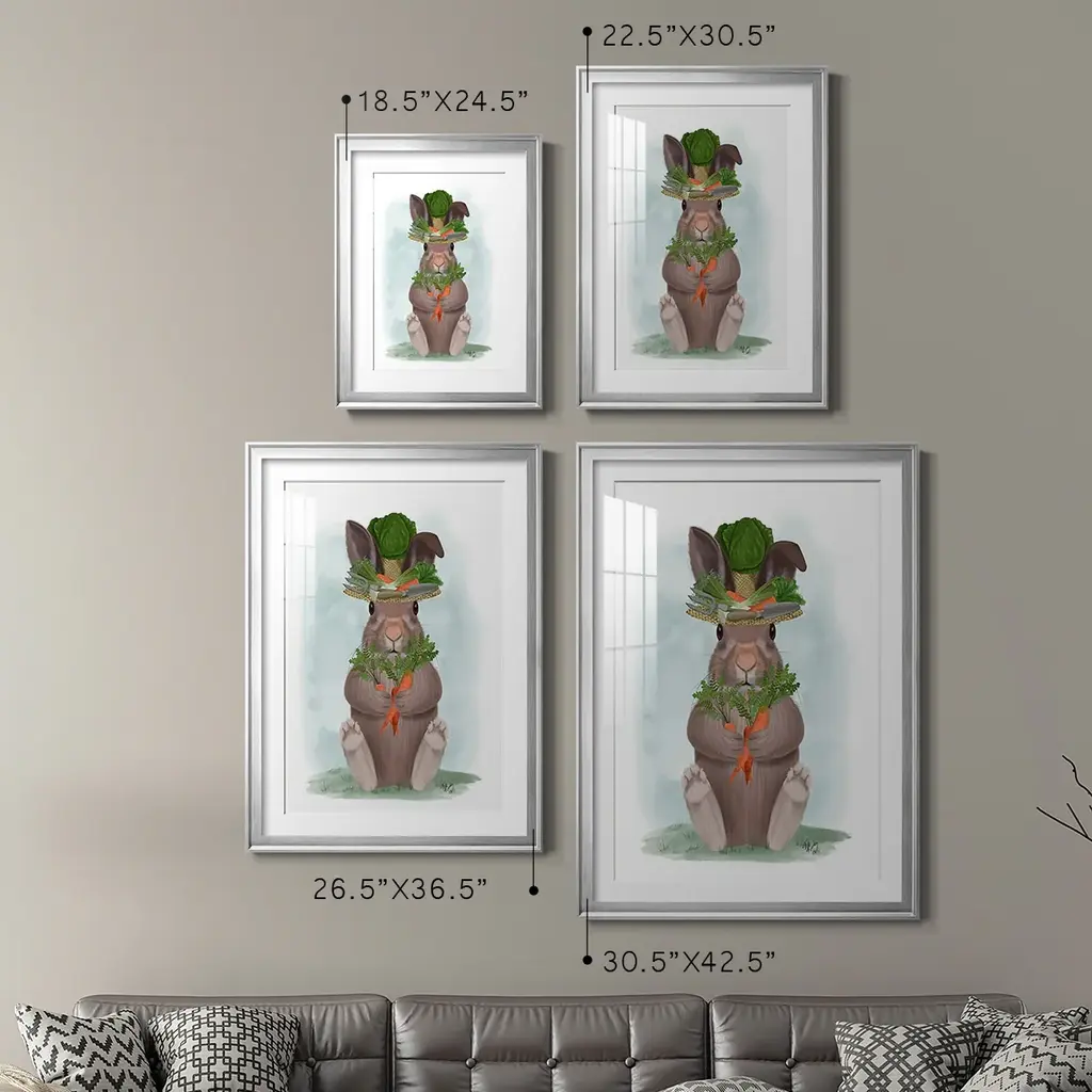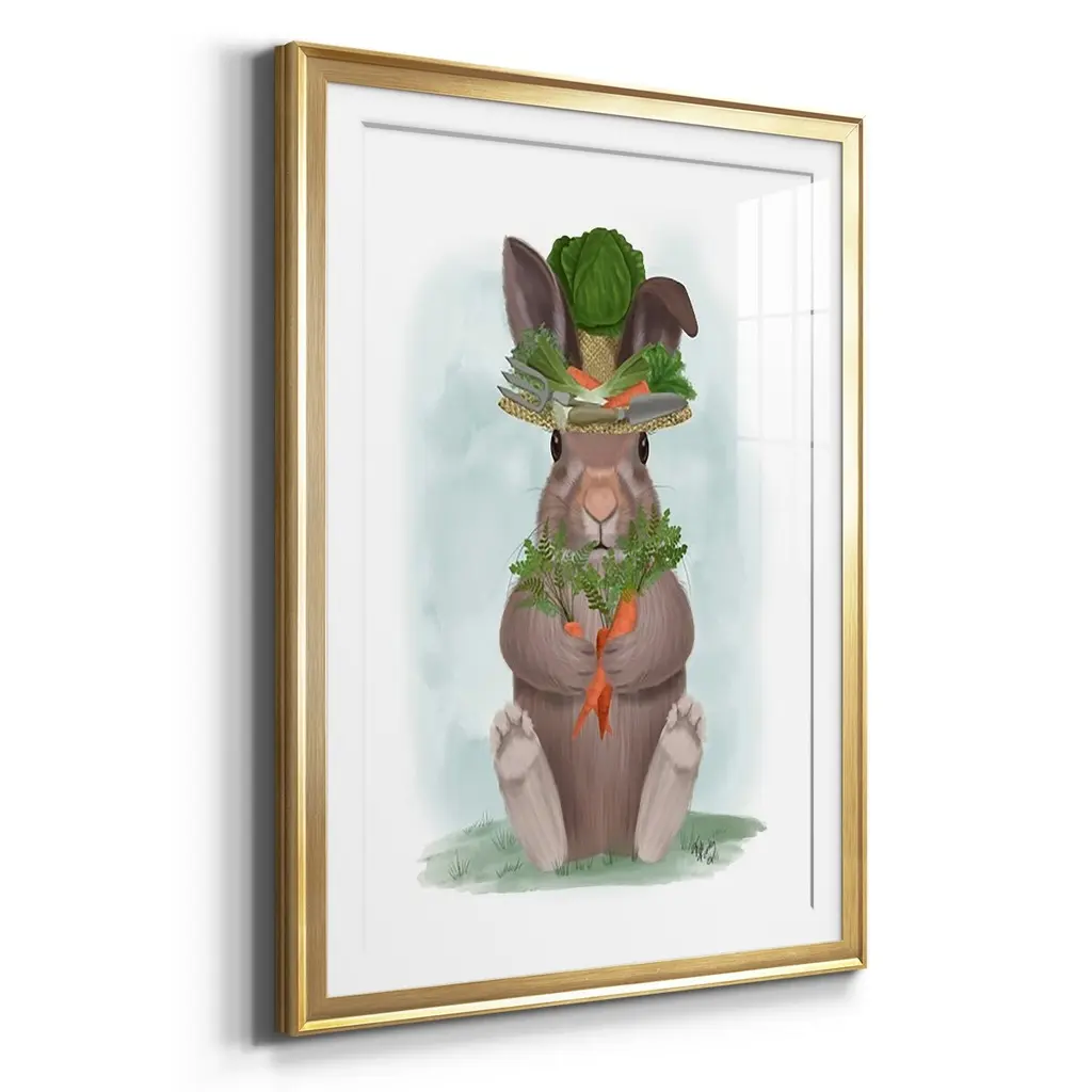 Rabbit Carrot Hat Premium Framed Print - Ready to Hang A Premium Framed Print created to last. Framed in distressed wood and available in an array of sizes and colors Featuring a beveled a solid wood stretcher bar, each piece comes ready to hand 4 SIZES AVAILABLE 30.5''X42.5'' - Overall Size 26.5'X36.5'' - Overall Size 22.5''x30.5'' - Overall Size 18.5''x24.5'' - Overall Size Each piece is made to order. Each piece comes with hanging hardware. Made in the USA Ready to Hang Giclee Paper Print Acrylic Glass Beveled Matt Board