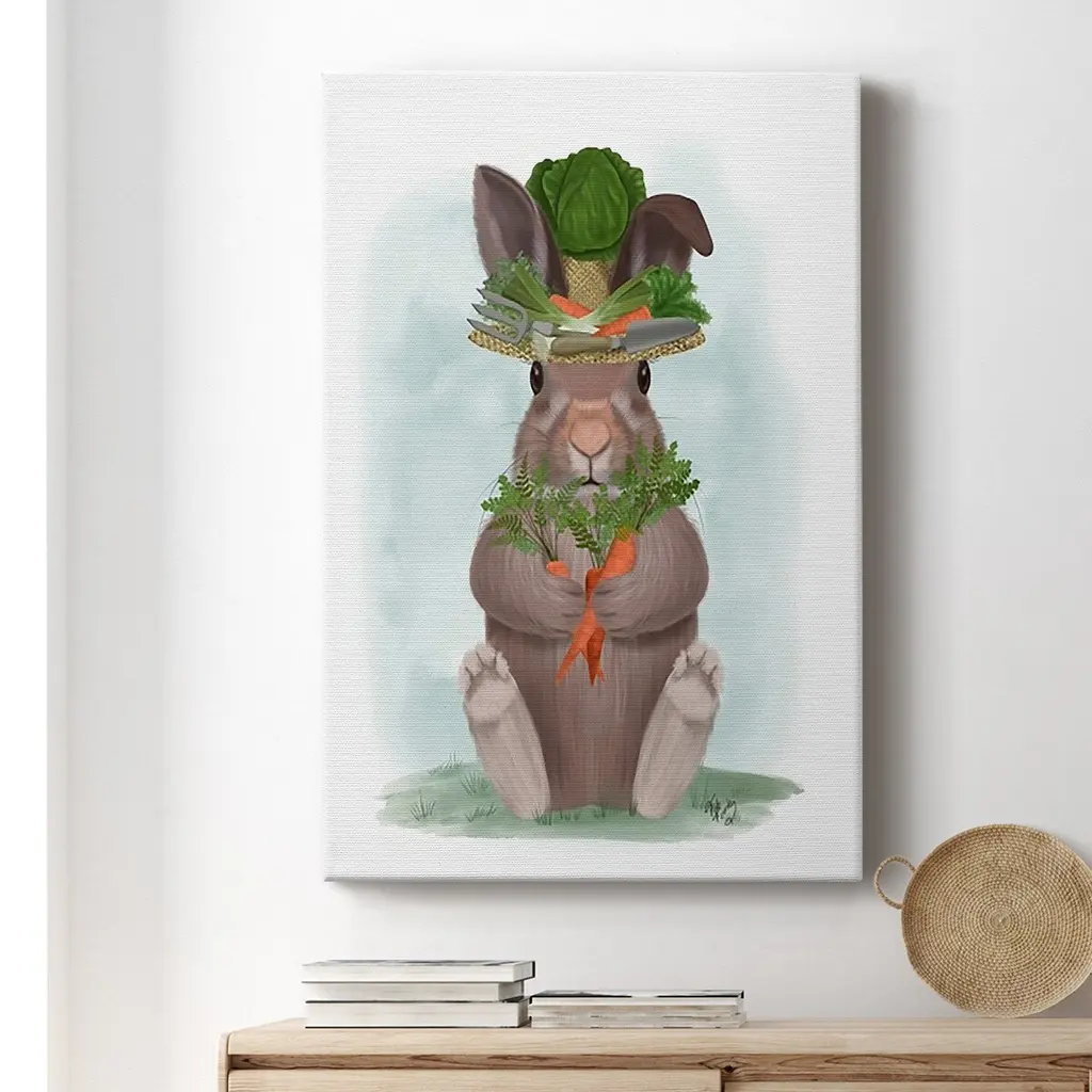 Rabbit Carrot Hat Premium Gallery Wrapped Canvas - Ready to Hang A premium hand stretched gallery wrapped canvas print created to last. Featuring a beveled a solid wood stretcher bar, each piece comes ready to hand 6 SIZES AVAILABLE 8''X12'' - Overall Size 12''X18'' - Overall Size 18''X27'' - Overall Size 24''x36'' - Overall Size 32''x48'' - Overall Size 40''x60'' - Overall Size Each piece is made to order. Built to Last Each piece comes ready to hang Solid wood stretcher Fade and Water resistant Made domestically