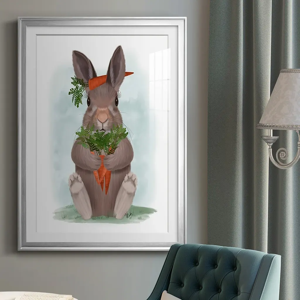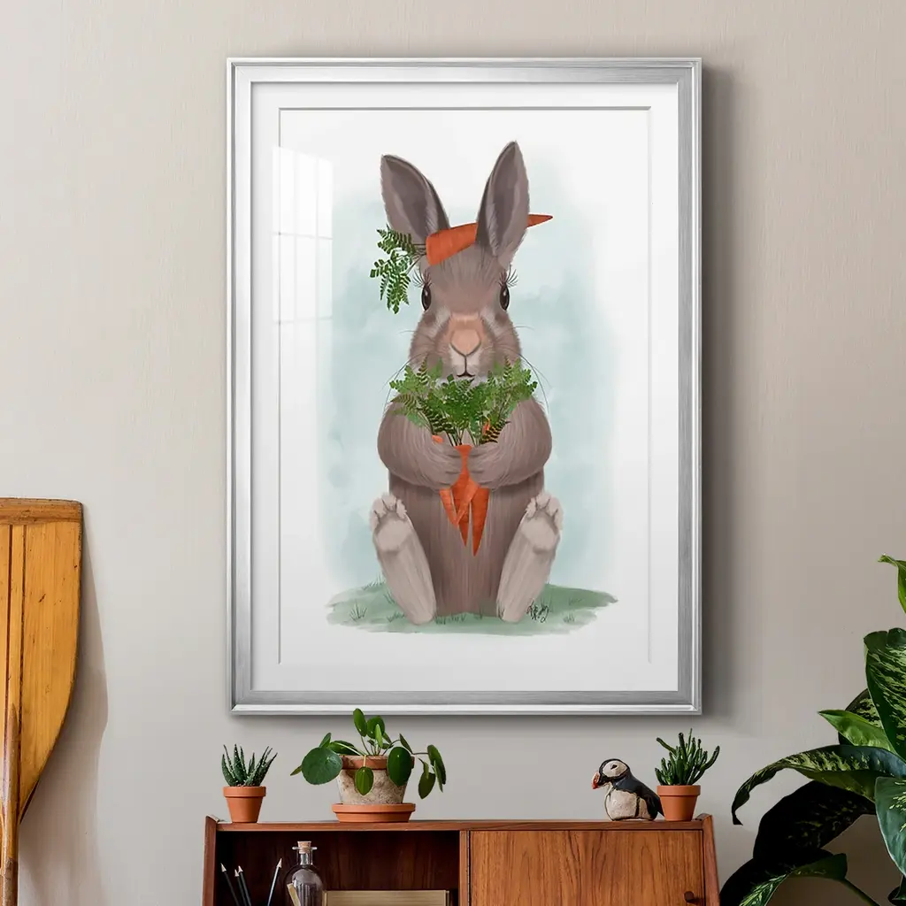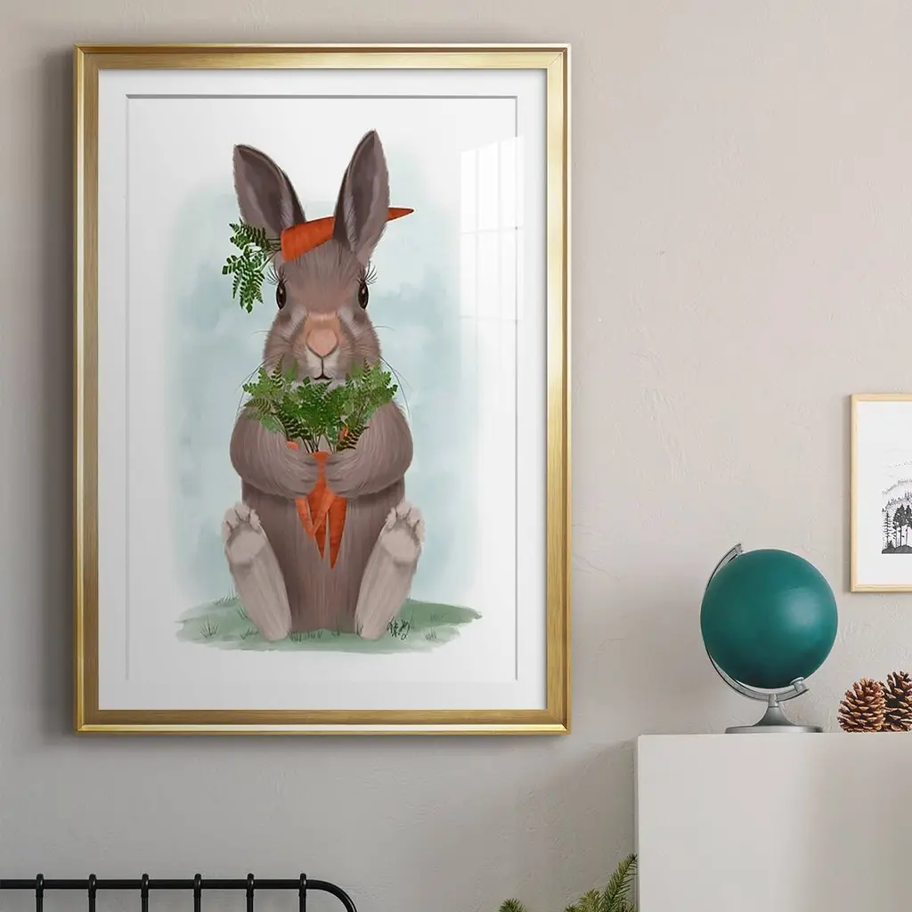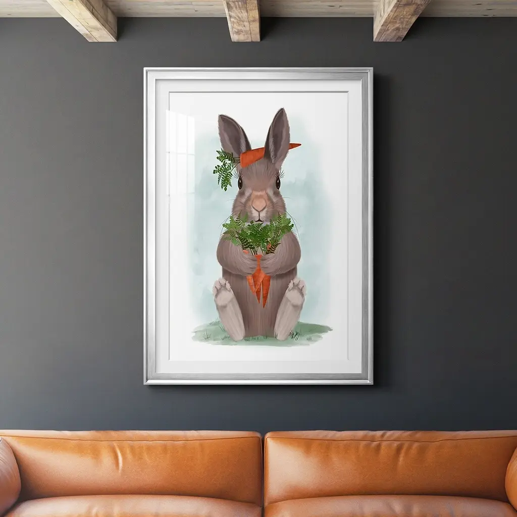 Rabbit Carrot Hug Premium Framed Print - Ready to Hang A Premium Framed Print created to last. Framed in distressed wood and available in an array of sizes and colors Featuring a beveled a solid wood stretcher bar, each piece comes ready to hand 4 SIZES AVAILABLE 30.5''X42.5'' - Overall Size 26.5'X36.5'' - Overall Size 22.5''x30.5'' - Overall Size 18.5''x24.5'' - Overall Size Each piece is made to order. Each piece comes with hanging hardware. Made in the USA Ready to Hang Giclee Paper Print Acrylic Glass Beveled Matt Board
