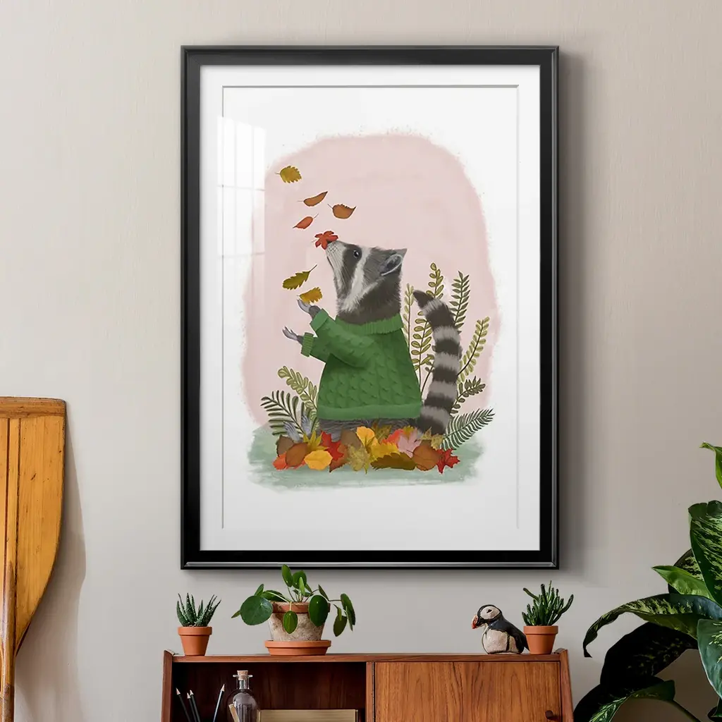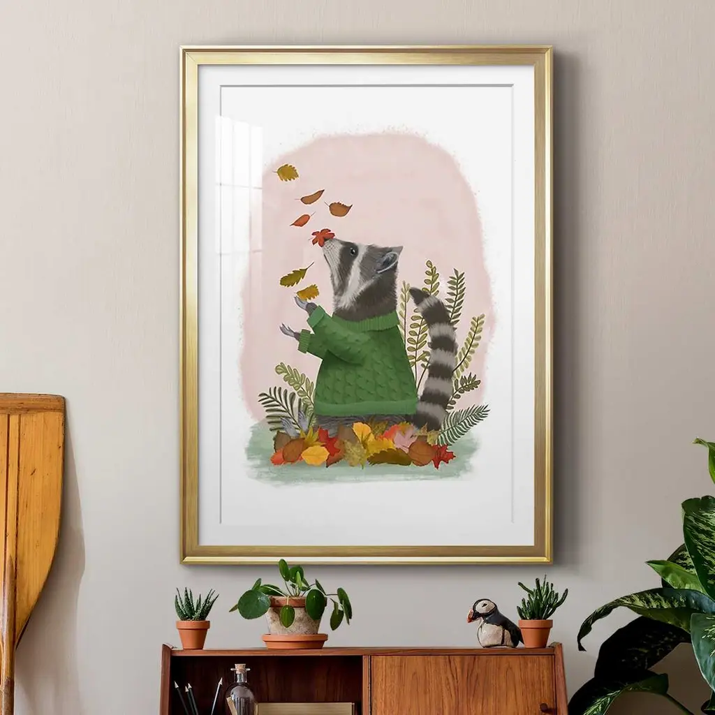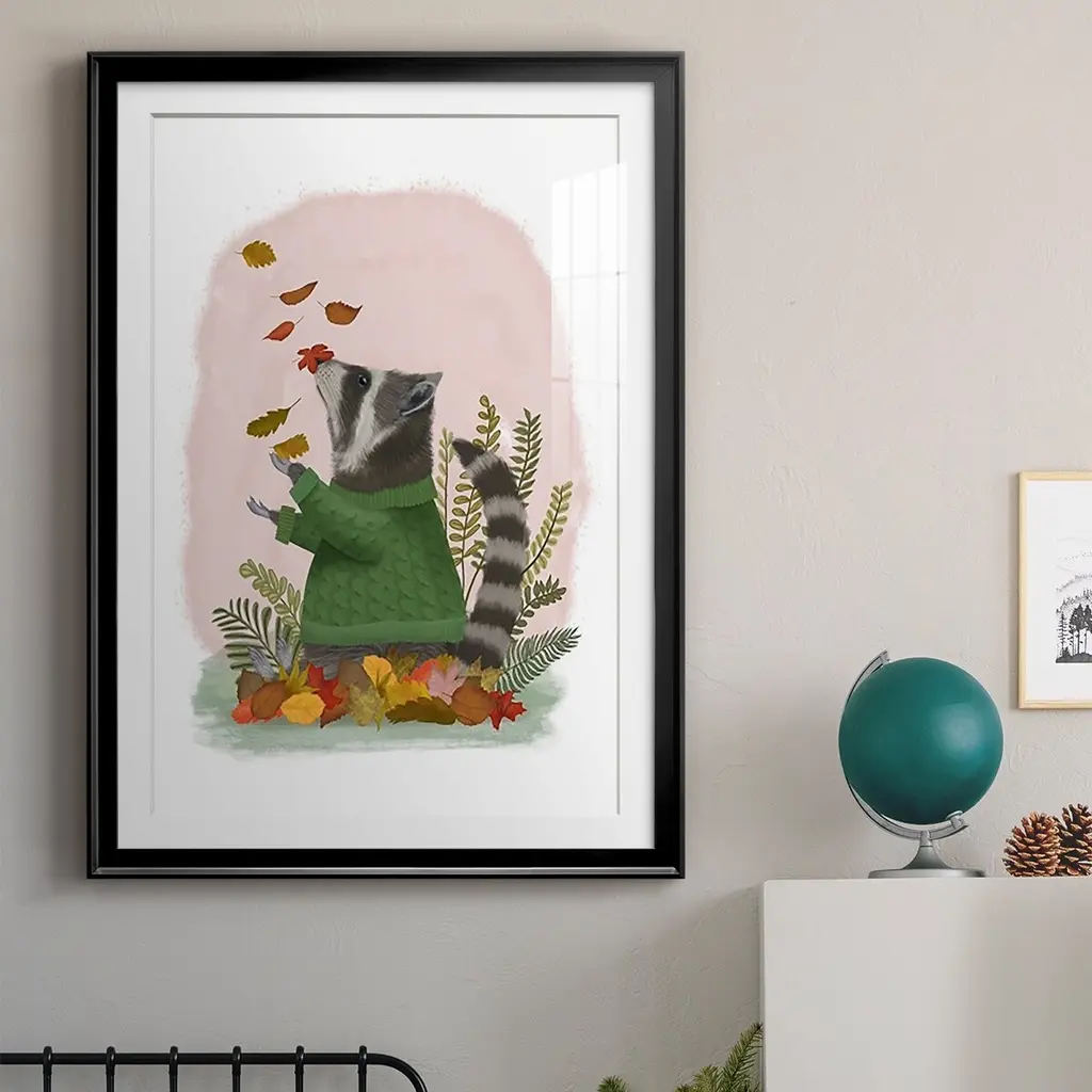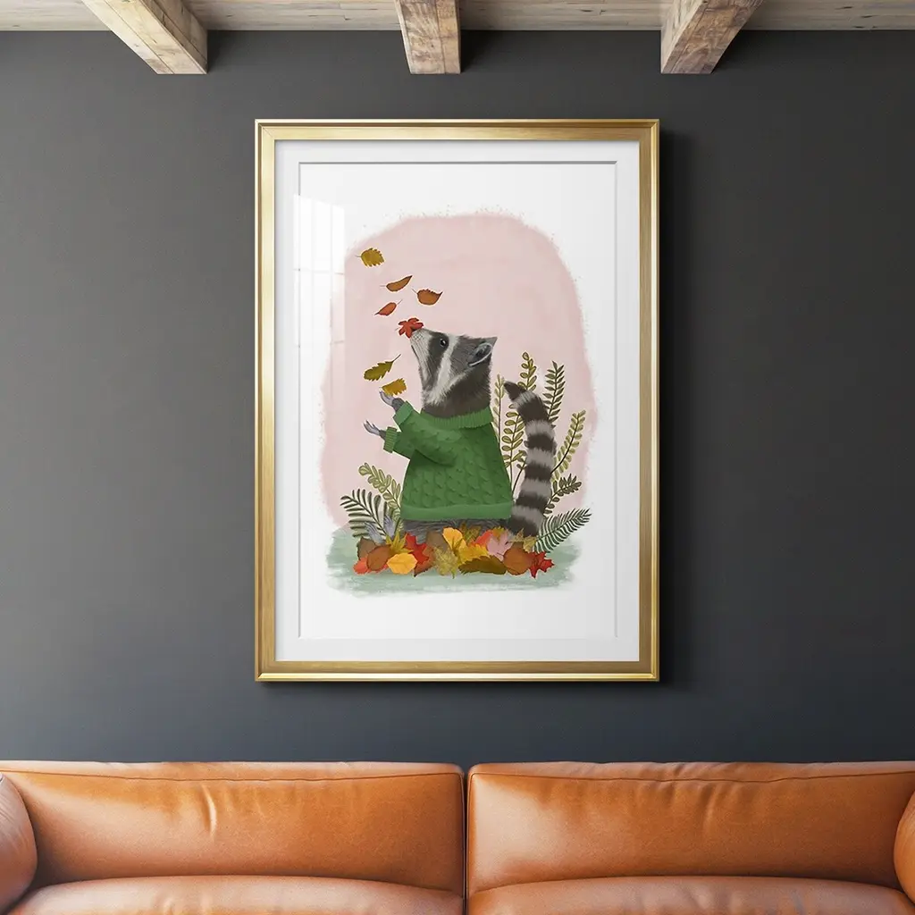 Raccoon Catching Leaves Premium Framed Print - Ready to Hang A Premium Framed Print created to last. Framed in distressed wood and available in an array of sizes and colors Featuring a beveled a solid wood stretcher bar, each piece comes ready to hand 4 SIZES AVAILABLE 30.5''X42.5'' - Overall Size 26.5'X36.5'' - Overall Size 22.5''x30.5'' - Overall Size 18.5''x24.5'' - Overall Size Each piece is made to order. Each piece comes with hanging hardware. Made in the USA Ready to Hang Giclee Paper Print Acrylic Glass Beveled Matt Board