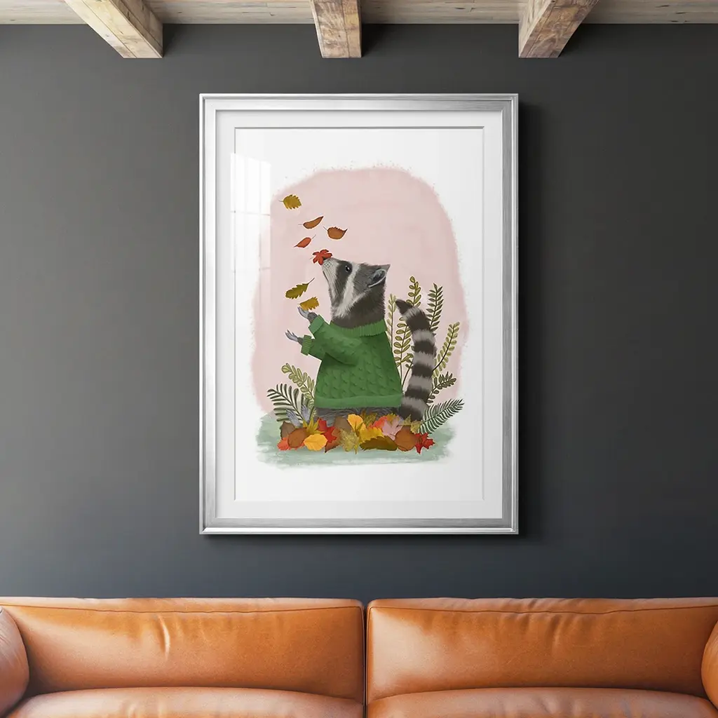 Raccoon Catching Leaves Premium Framed Print - Ready To Hang - 30.5x42.5 - Silver