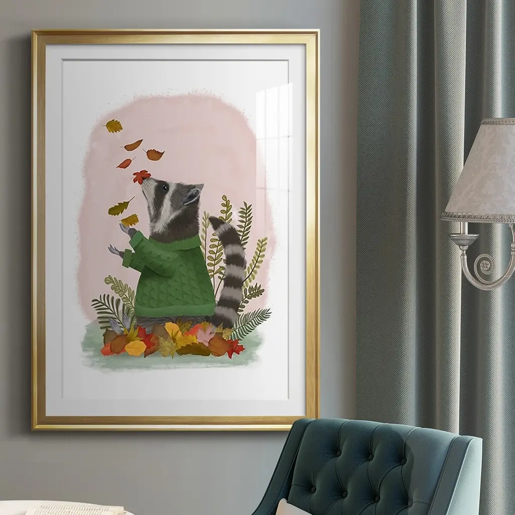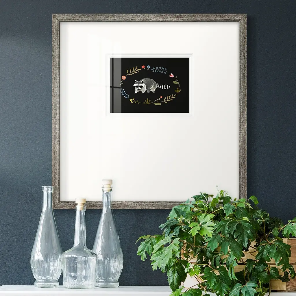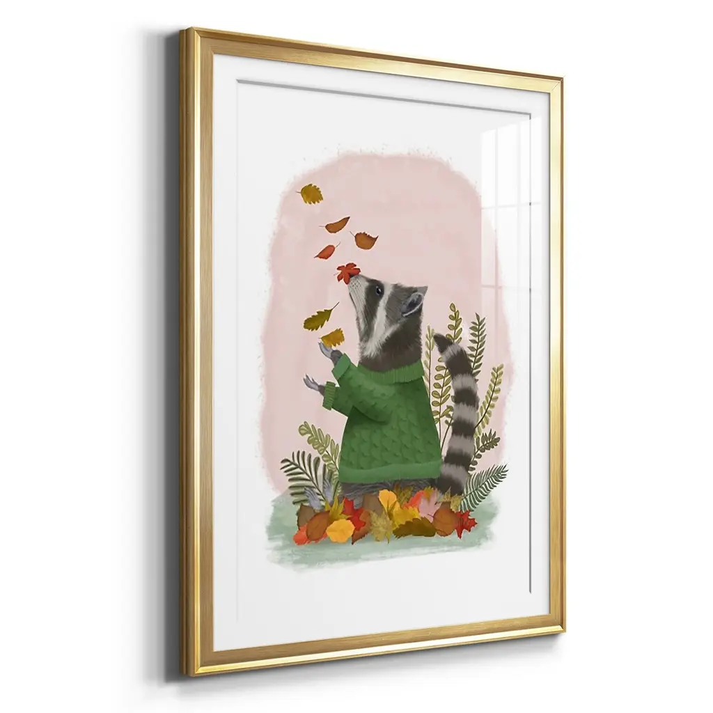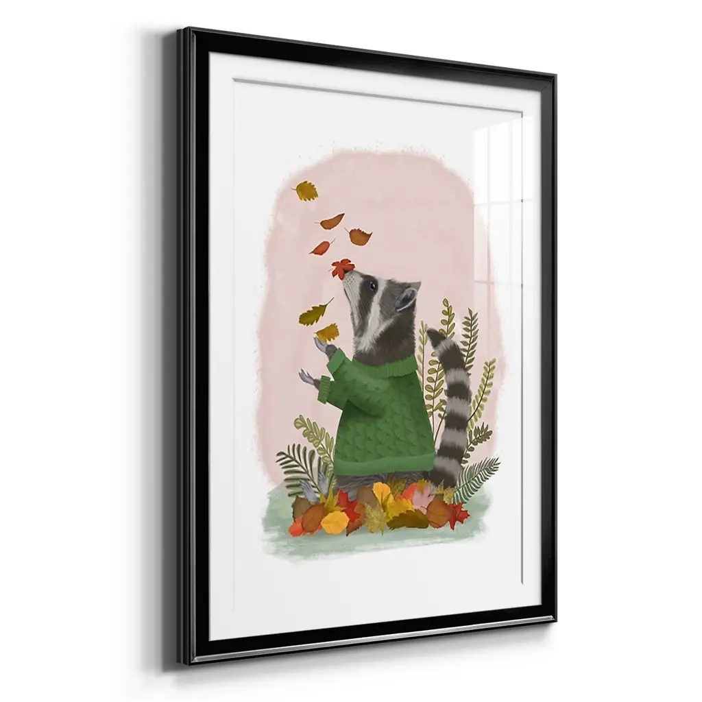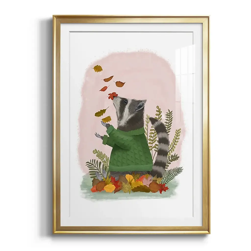 Raccoon Catching Leaves Premium Framed Print - Ready to Hang A Premium Framed Print created to last. Framed in distressed wood and available in an array of sizes and colors Featuring a beveled a solid wood stretcher bar, each piece comes ready to hand 4 SIZES AVAILABLE 30.5''X42.5'' - Overall Size 26.5'X36.5'' - Overall Size 22.5''x30.5'' - Overall Size 18.5''x24.5'' - Overall Size Each piece is made to order. Each piece comes with hanging hardware. Made in the USA Ready to Hang Giclee Paper Print Acrylic Glass Beveled Matt Board