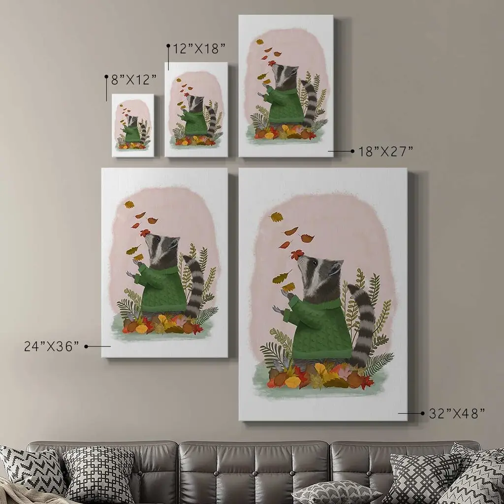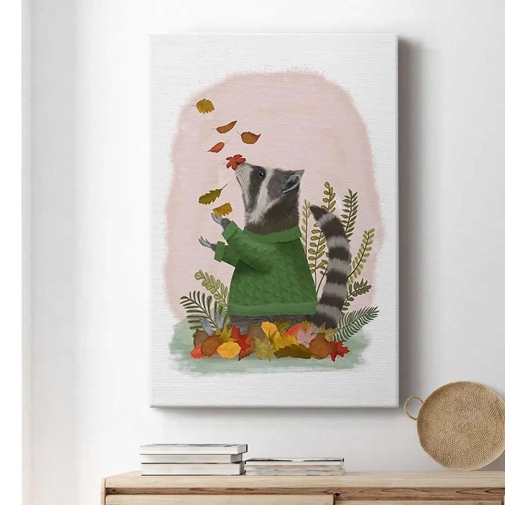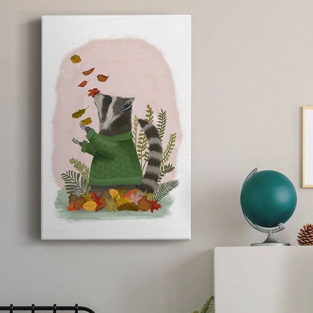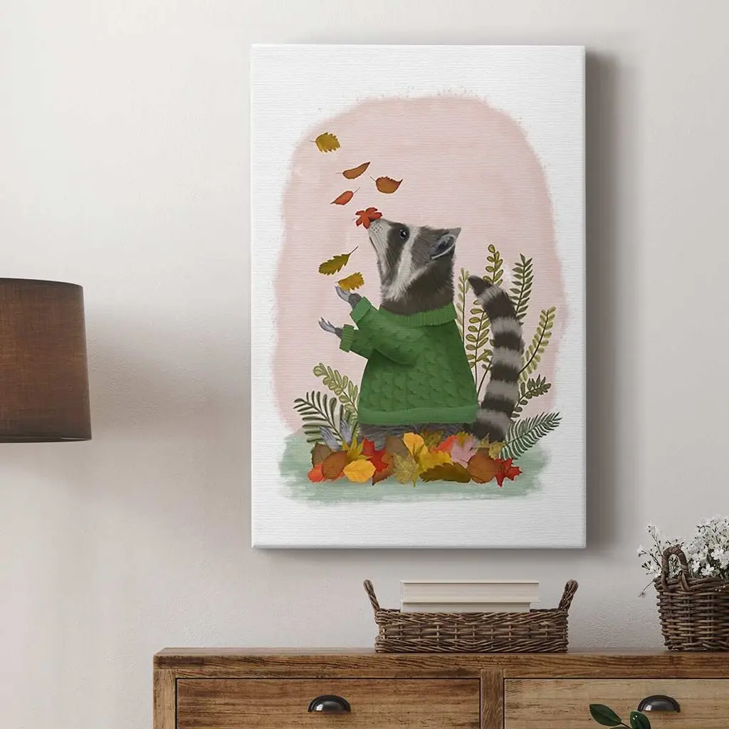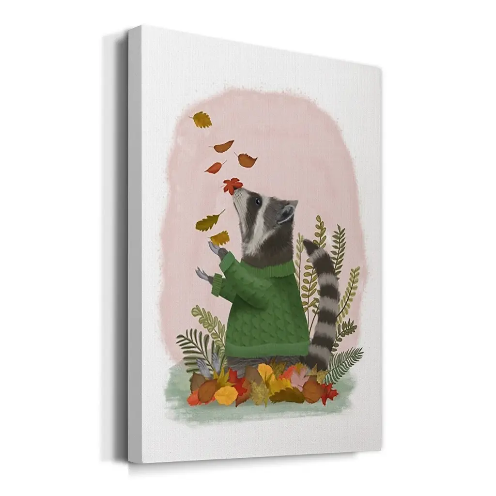 Raccoon Catching Leaves Premium Gallery Wrapped Canvas - Ready to Hang A premium hand stretched gallery wrapped canvas print created to last. Featuring a beveled a solid wood stretcher bar, each piece comes ready to hand 6 SIZES AVAILABLE 8''X12'' - Overall Size 12''X18'' - Overall Size 18''X27'' - Overall Size 24''x36'' - Overall Size 32''x48'' - Overall Size 40''x60'' - Overall Size Each piece is made to order. Built to Last Each piece comes ready to hang Solid wood stretcher Fade and Water resistant Made domestically