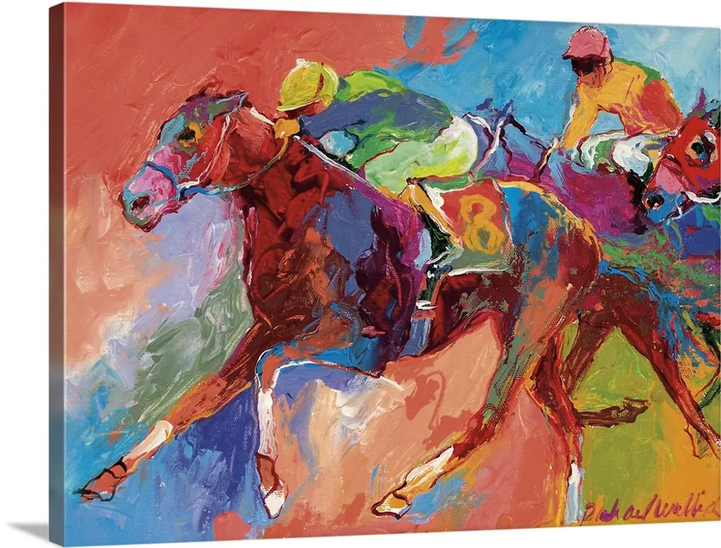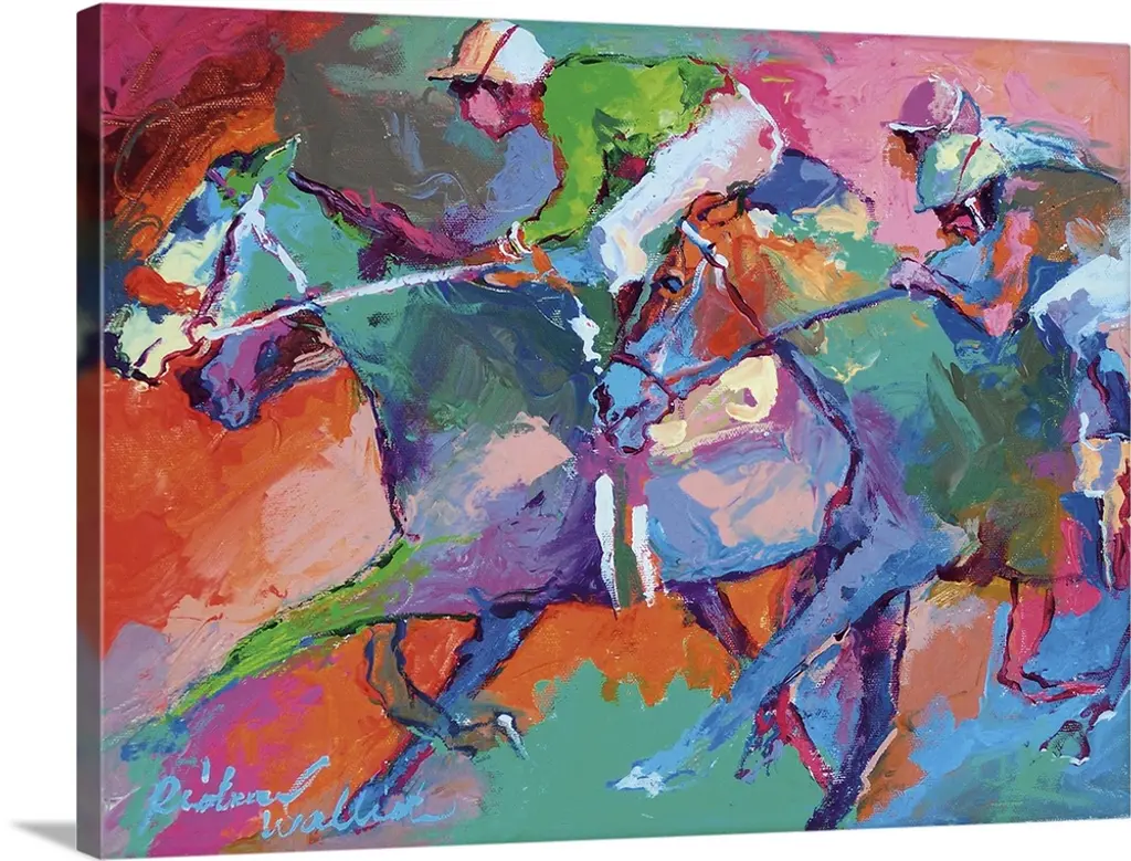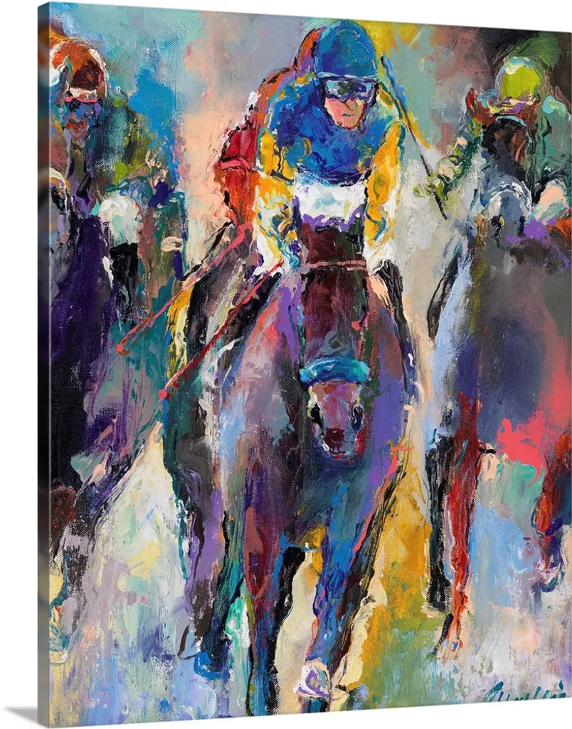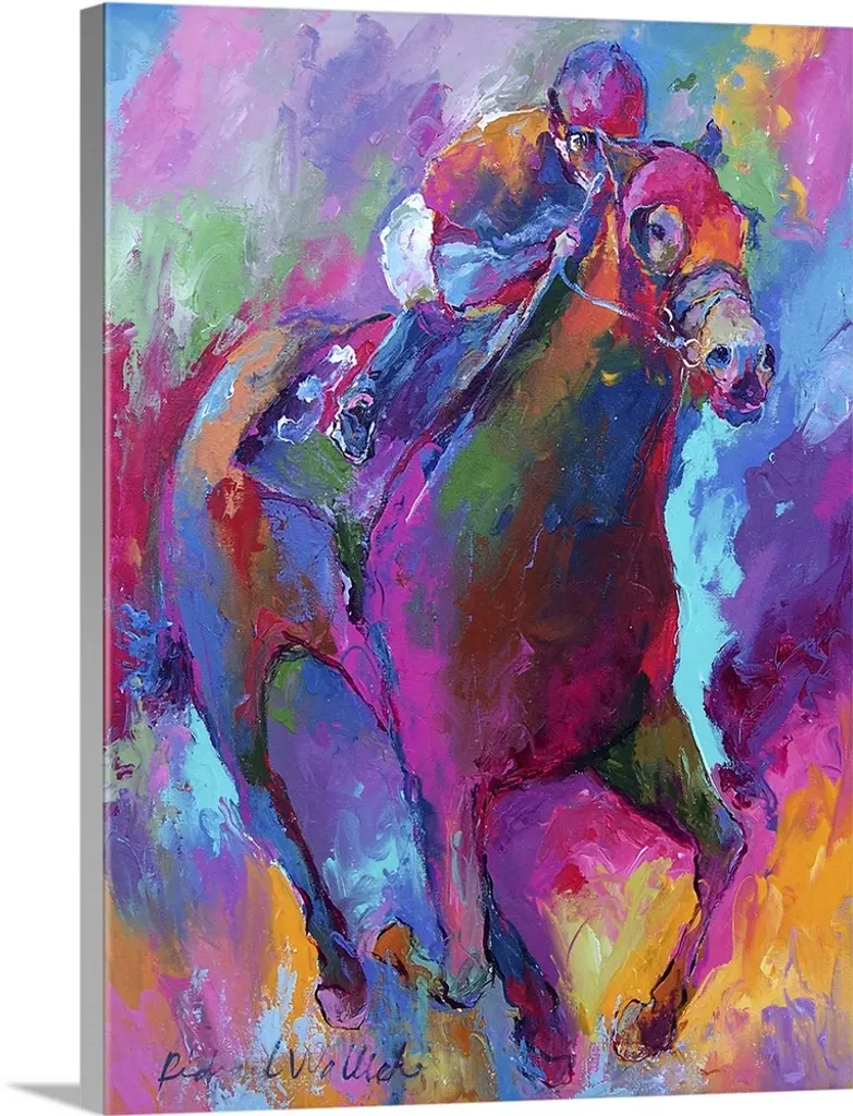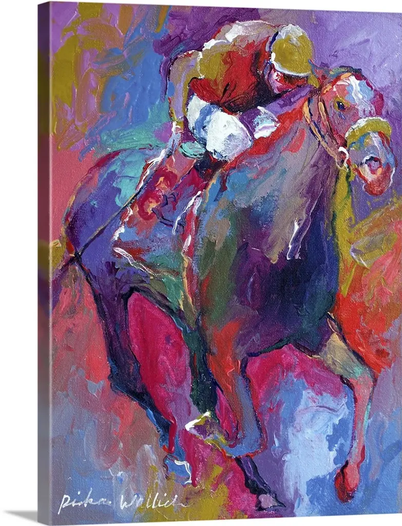 Contemporary vibrant colorful painting of a jockey on horseback.