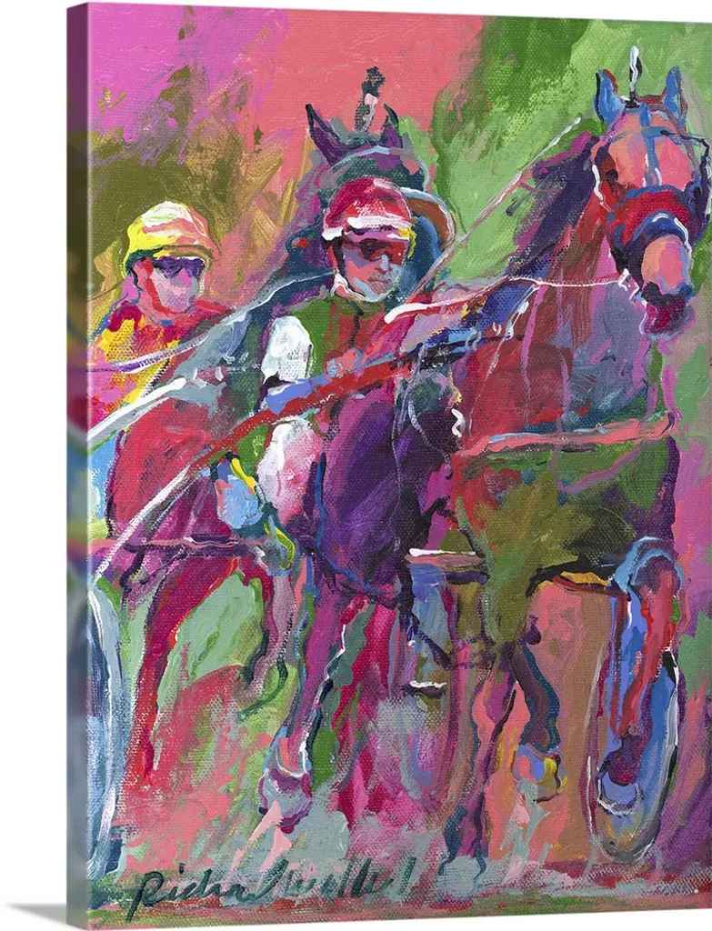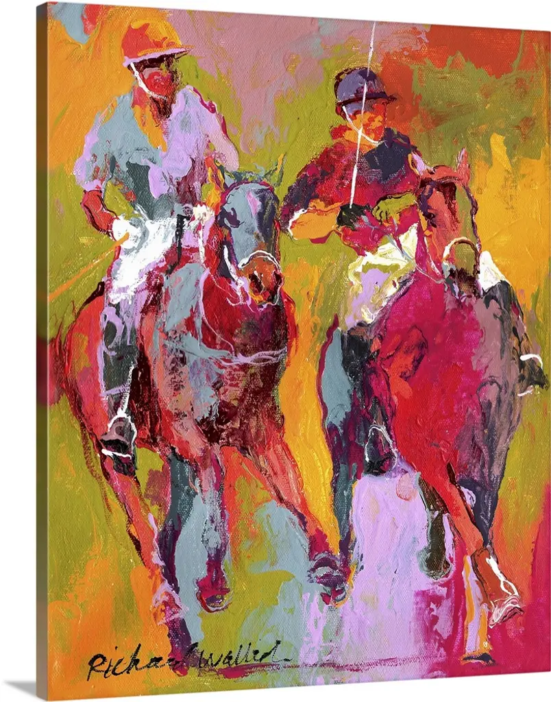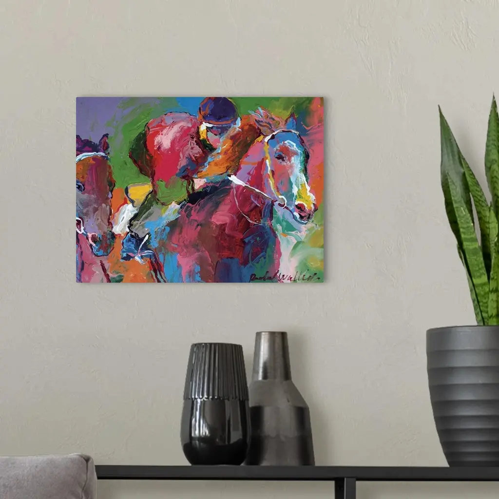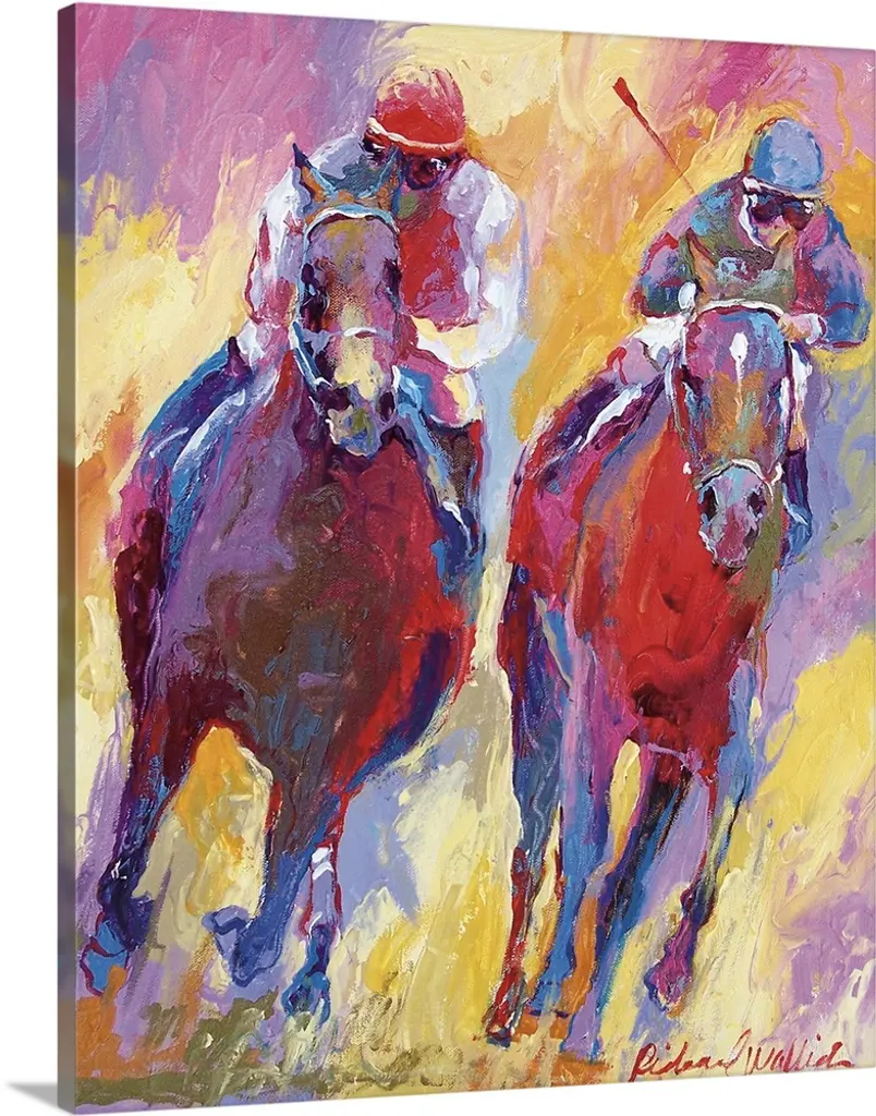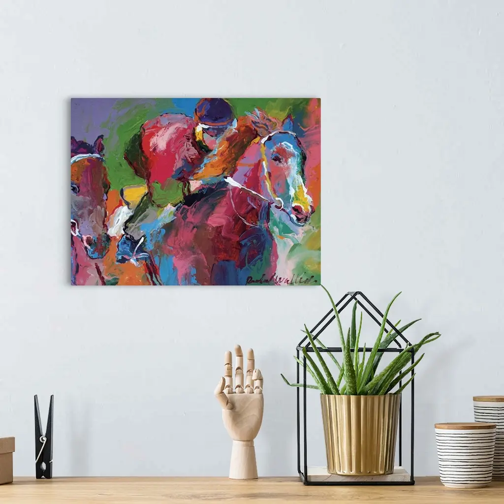 Contemporary vibrant colorful painting of a jockey on horseback.