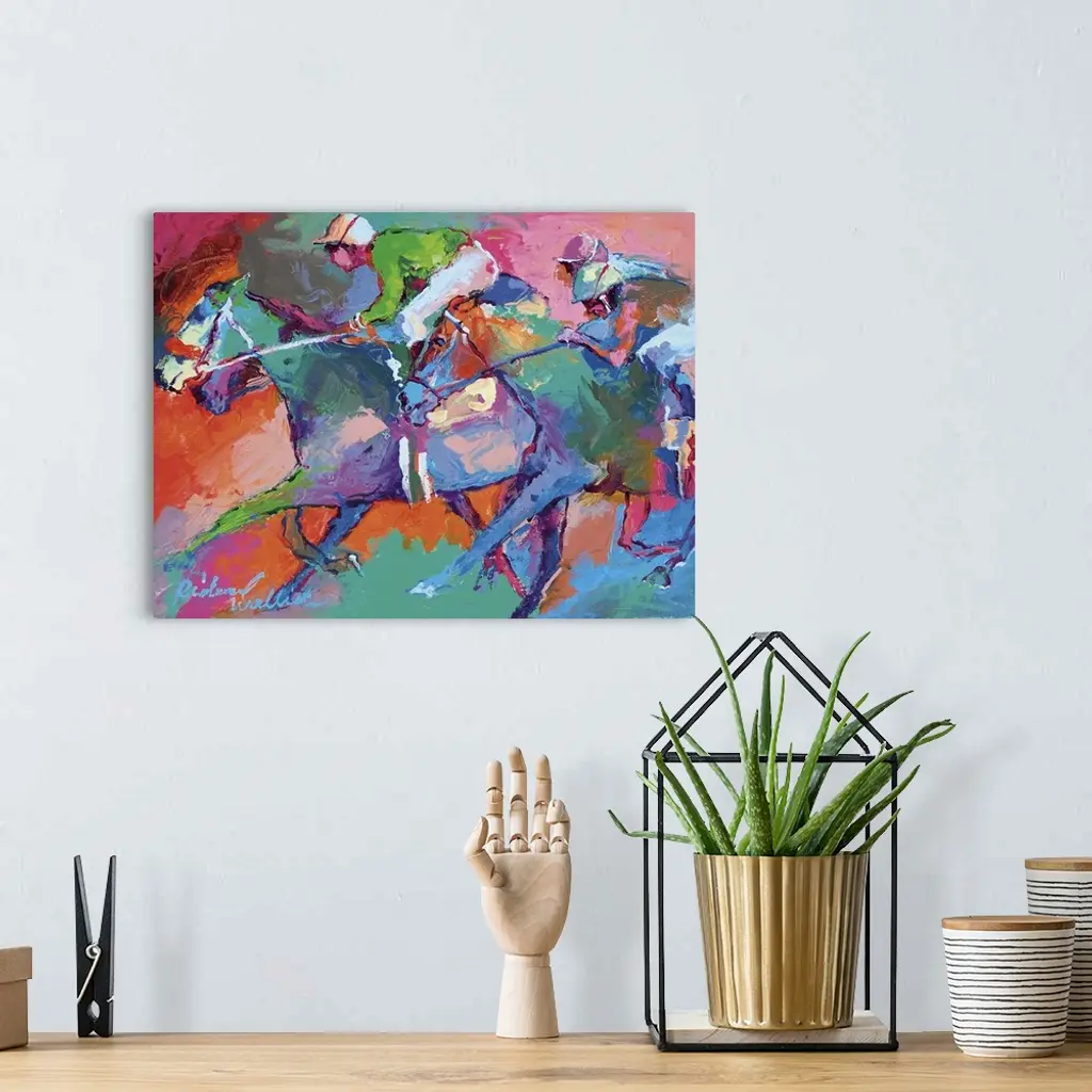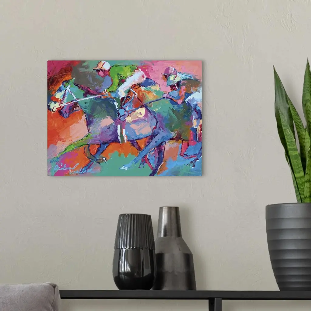 Contemporary vibrant colorful painting of a jockey on horseback.