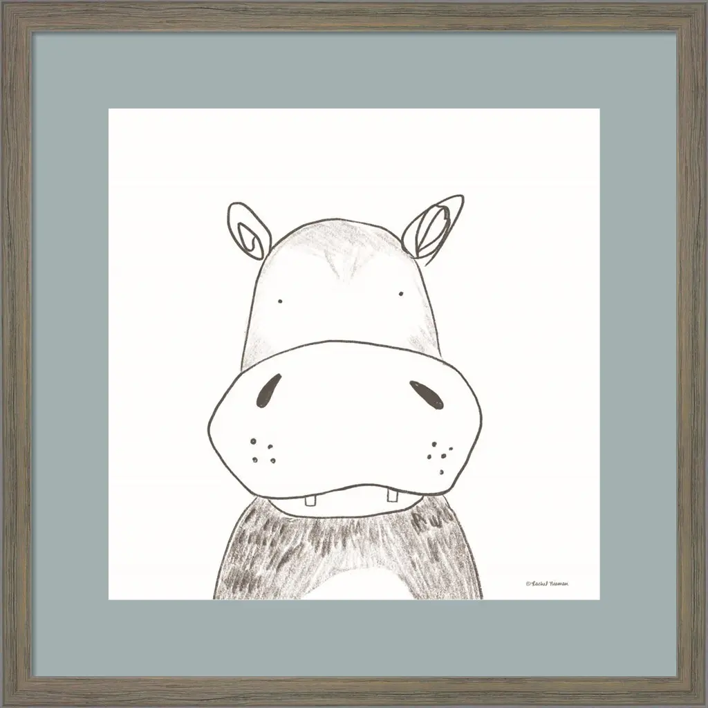 Hippo Line Drawing by Rachel Nieman is a high quality piece of framed artwork. The finished size of this piece is 17" X 17". It has a Distressed Grey Knotty Wood frame, is single matted and finished with high quality Acrylic Plexiglass. 100% Satisfaction Guaranteed.