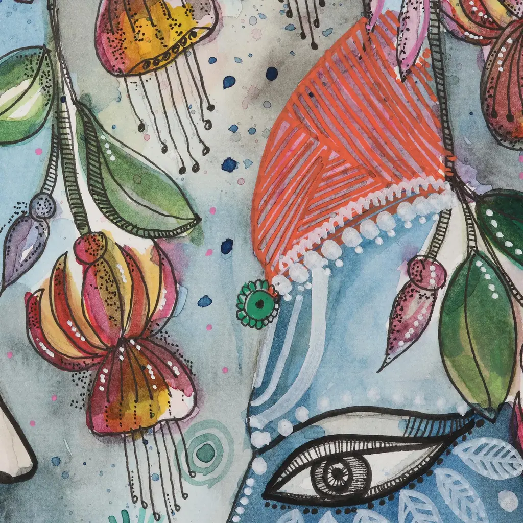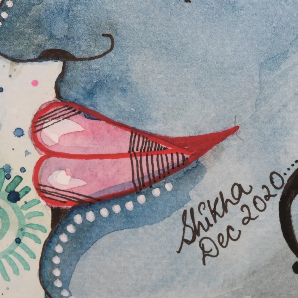 Indian artisan Shikha Kaistha captures the moment when mythological Hindu lovers Radha and Krishna first lock eyes in this stunning watercolor. Using harmonious hues of pink, orange, and blue, the artist paints the couple in traditional attire and elaborate jewels.