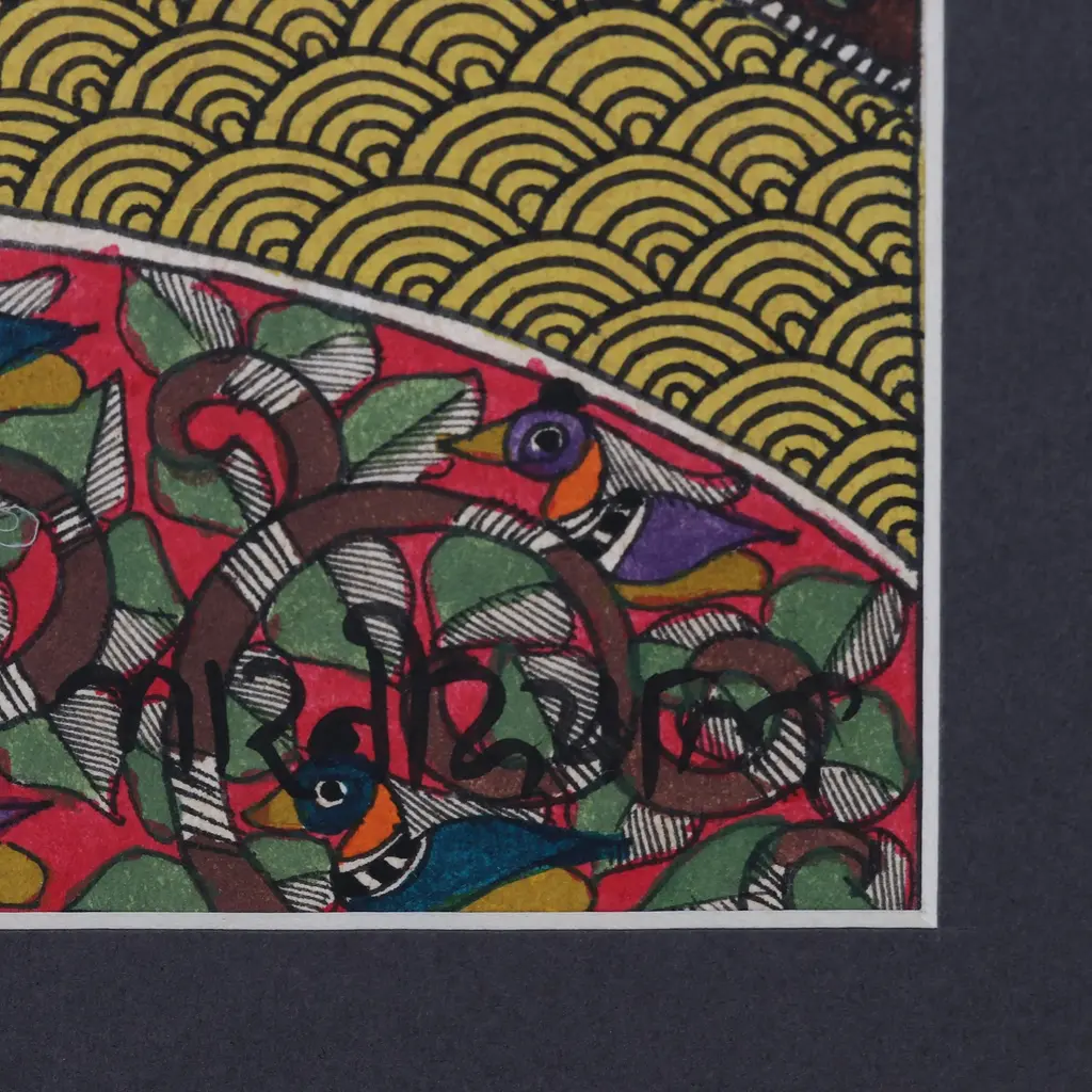 Under an idyllic tree dotted with abundant songbirds, Radha and her Gopies lounge in an enchanted garden of energy. As she plays the flute to celebrate love and compassion on Earth, she holds out her other hand for a songbird keen earn her motherly affection. Worshipped as the Supreme Goddess and source of all energy, the revered deity visibly occupies the foreground of 'Glorious Radha', appearing the closest to the angle of perspective while flanked by her admiring Gopies. A continuous fabric of nature wraps around the Gopies, signifying their eternal blissful love. One Gopi holds out a sacred lotus flower for Radha, symbolizing her role as the womb and origin of Gopies, love and energy. Artist Bharti Dayal creates this divine scene in the Madhubani Style to highlight the significance of Radha in Hindu society, without deviating from the pure nature of her existence. Solid hues and flowing shapes form the composition of this painting, creating blissful emotion proper of a deity."Madhubani paintings are in fact a simplistic manifestation of the philosophical heights achieved by Indian civilization for the universal power of love, longing and peace; the quest of all beings," Dayal says.