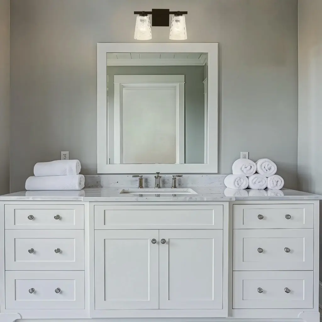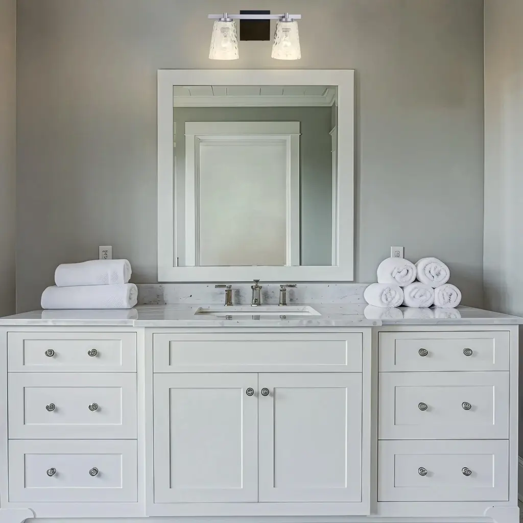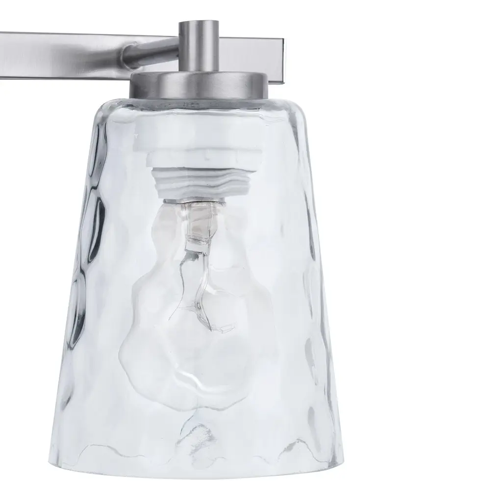 The Radiance Modern 2-Light Vanity Light is the perfect addition to any modern bathroom. Made from durable steel, this vanity light is built to last and features clear textured glass shades that provide a soft and warm glow.【Stylish Design】 : The glass finish adds a touch of elegance to your bathroom decoration.【Bulb Compatibility】 : The vanity light uses a 60 watt E26 base bulb, which is not included with the product.【Durable Construction】 : Made from high-quality steel, this vanity light is built to last.【Damp-Rated】 : This light is safe for use in damp environments like bathrooms and laundry rooms.【Safety Features】 : This modern vanity light has an ETL safety rating for added peace of mind.