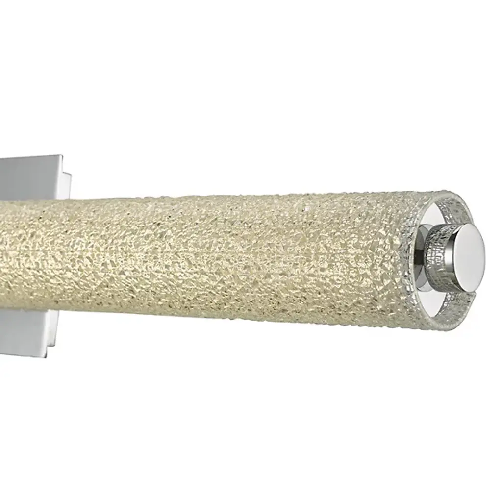 The Radius LED Vanity Light from Abra Lighting brings a touch of sparkling glamor to bathrooms and vanities. Supported by a sleek rectangular backplate, the fixture boasts a single, elongated shade constructed in a hand-blown diamond glass style. The cylindrical shade houses an integrated LED light source that brings the piece to life when illuminated, with each textured facet elegantly glistening with light, making it ideal for spaces that call for a stylish and functional addition.