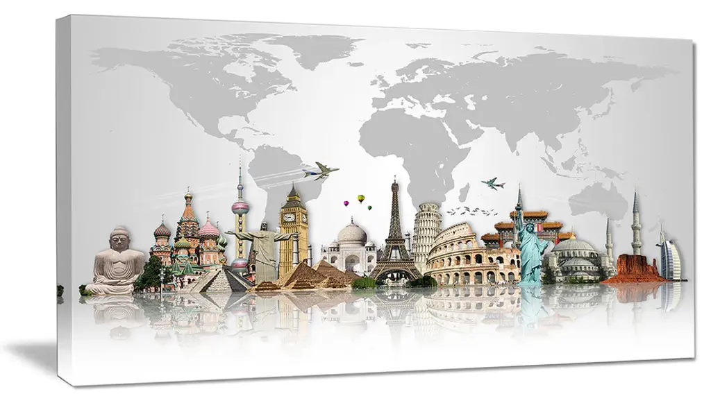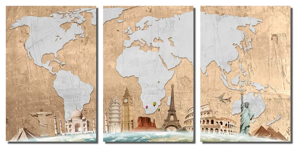 36"œ x 18"œ total size. Ready To Hang! (3 pieces - 12"œ x 18"œ each). 3 Panel Split (Triptych) Travel World Map Metal Print featuring Raffia Beige, Silver colors and world landmarks. Modern metal wall art for home or office wall decor & interior design. Printed on Luxurious, HD aluminum glossy metal panels. Multi Panel art.. HD aluminum panels. Metal print wall art. Includes Shadow Wall Mount on the back.• Aluminum Metal Wall Art• Made in USA• Ready to hang - No assembly required• Shadow mount hardware on the back• 0.045"œ thick HD Aluminum Panels• Scratch resistant, glossy finish• Superb color clarity, luxurious prints• Epson printing process• For indoor or moisture rich environment use• Easy to clean. Gently wipe with microfiber cloth.