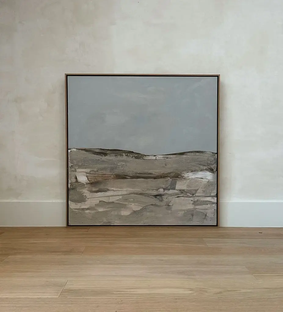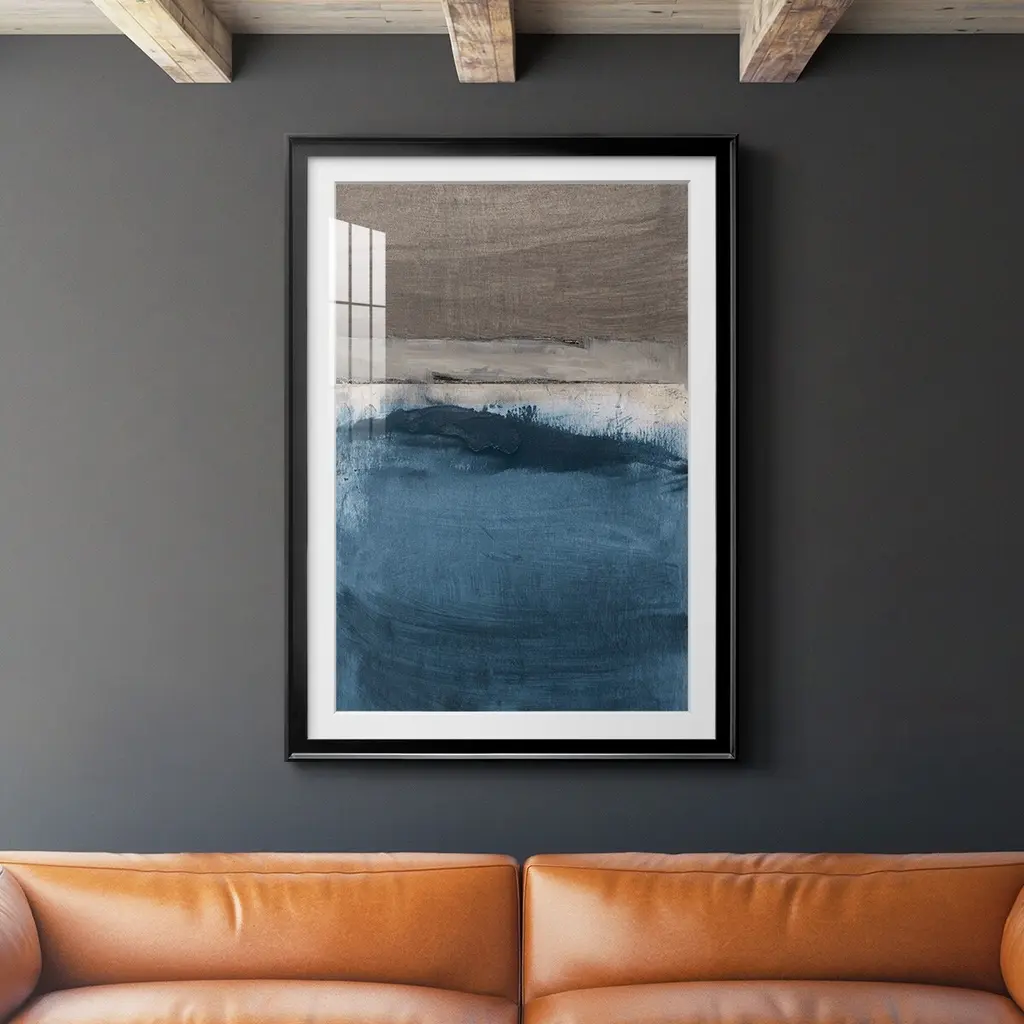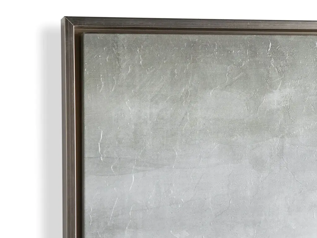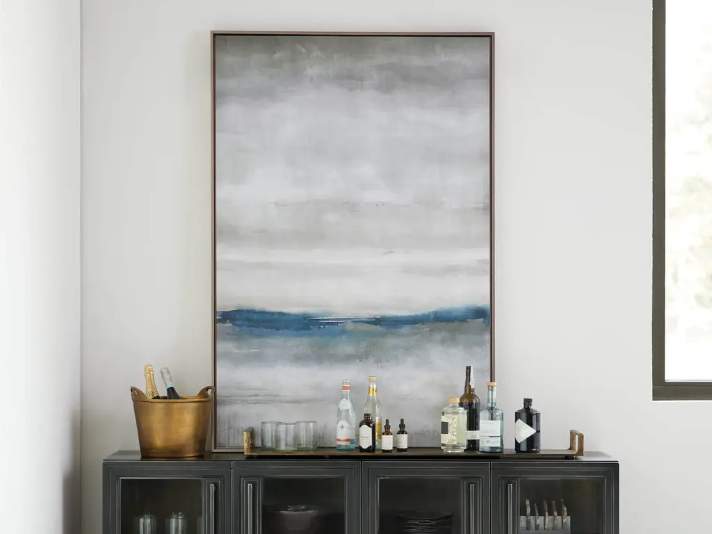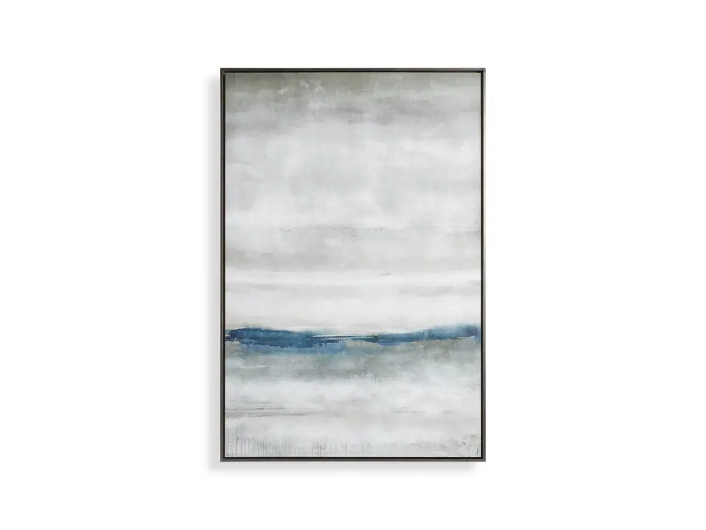 Let the ocean waves wash over you with the cool blues and greys of this serene abstract landscape. Colors are carefully layered to create the look and feel of a storm over water. Placed in a silver wooden frame without glass, this piece allows you to take in the unique texture of each brushstroke. High-quality giclée reproduction of an original oil painting. Printed on canvas. Wood frame is 3/8" wide with silver finish. Hangs vertically from back-mounted D-rings. Artist: Elena Carlie