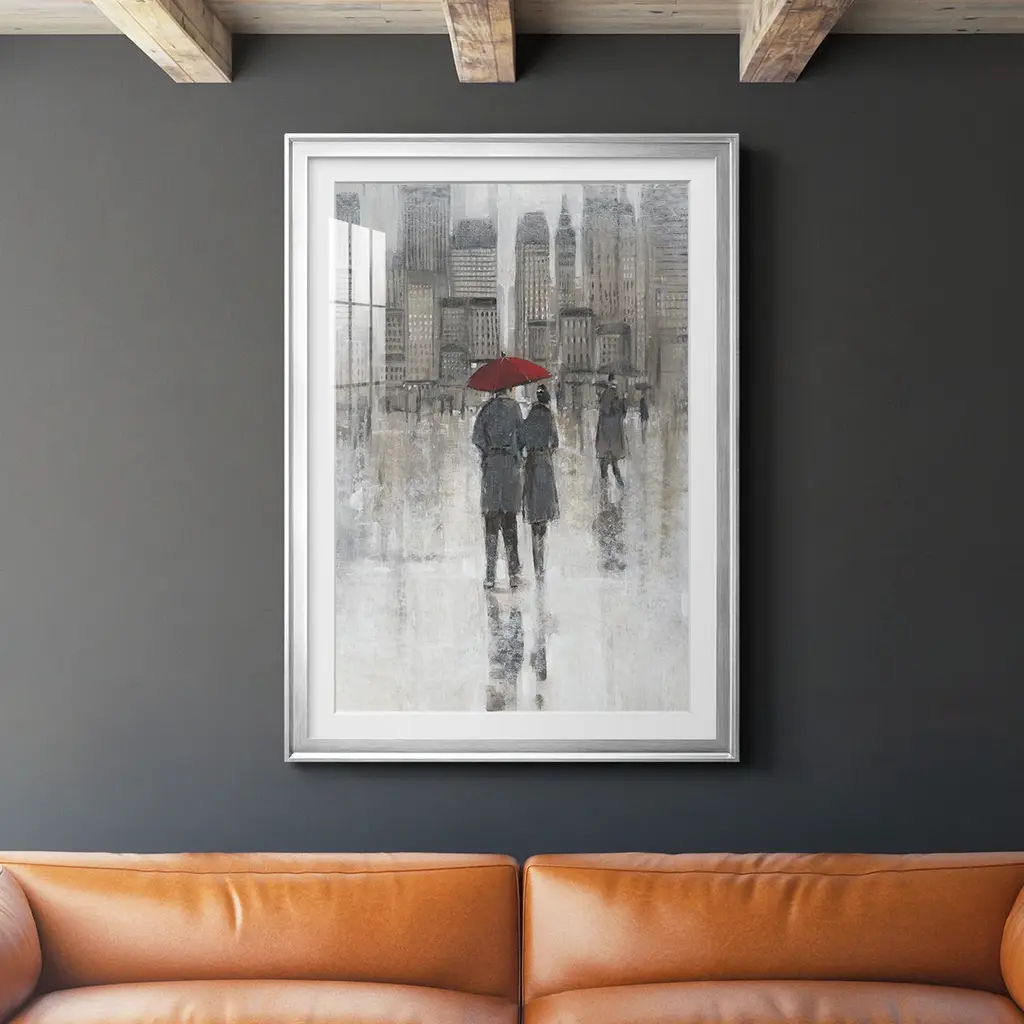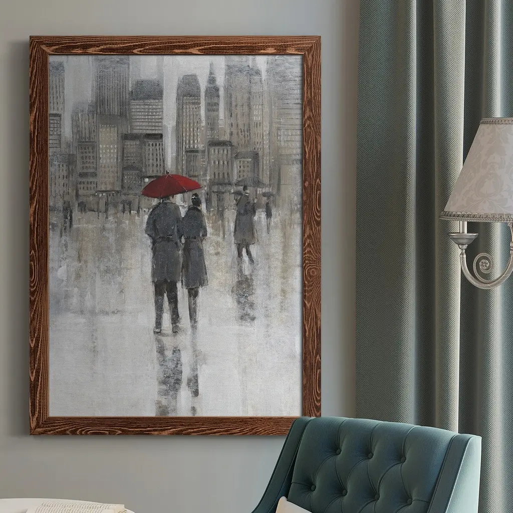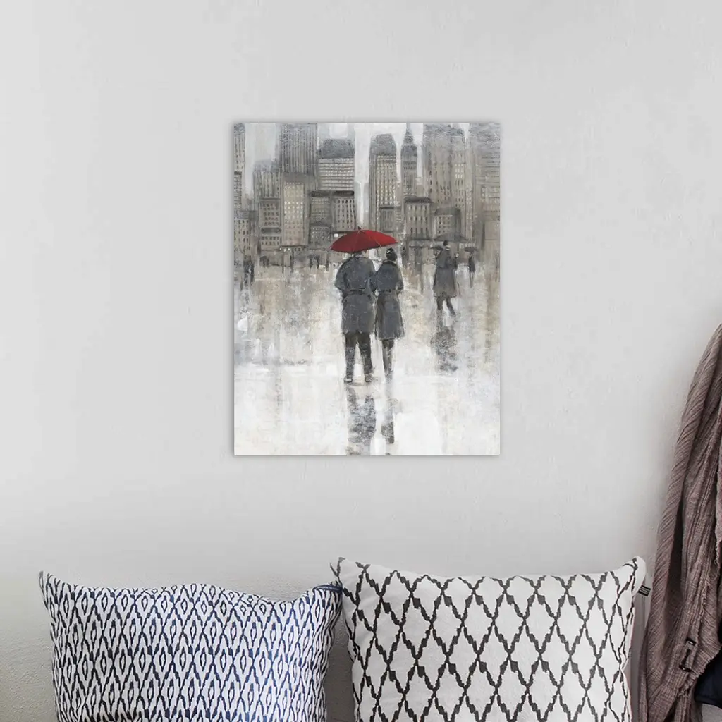 Contemporary artwork of a couple in the city sharing a red umbrella.