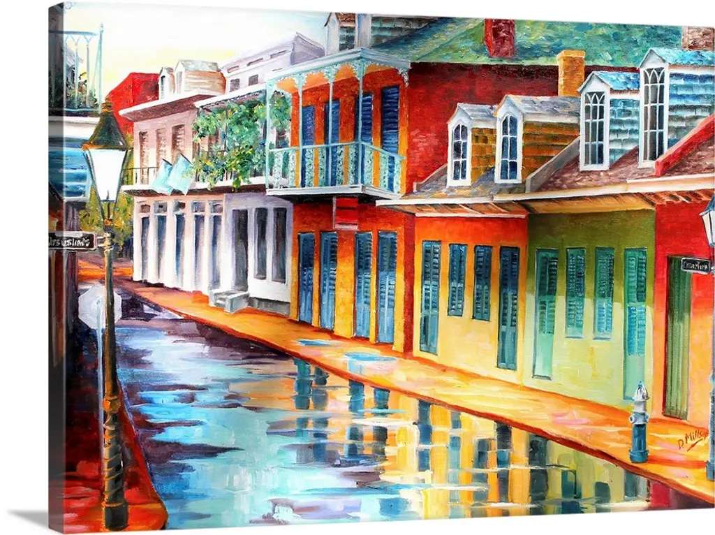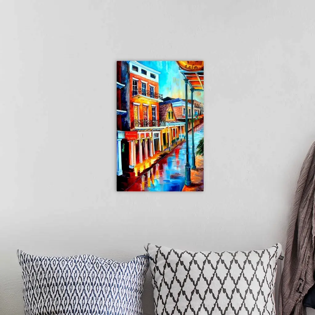 Contemporary painting of the reflection of the lights on the wet street after a rainstorm in New Orleans, Louisiana.