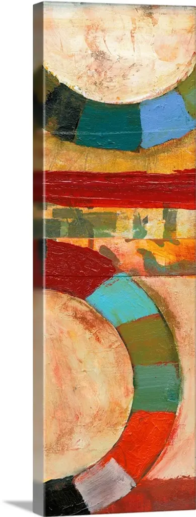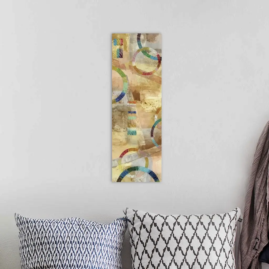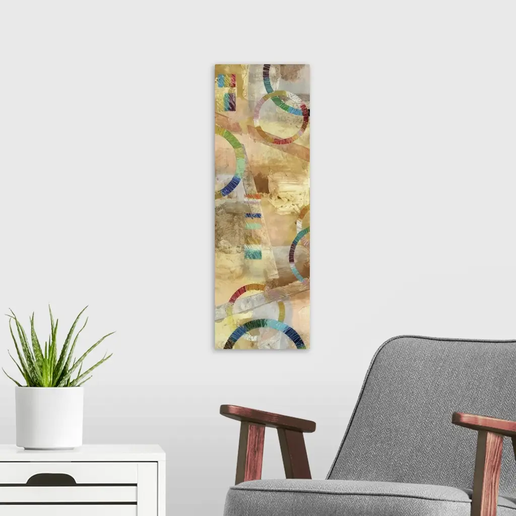 Large abstract painting created with rainbow circles and lines and a background filled with neutral colors.