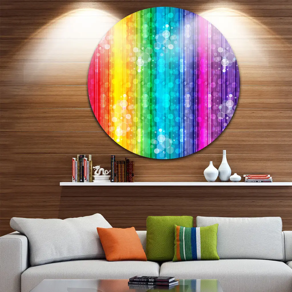 Bring Contemporary Abstraction to your home with this large Circle Metal wall art. This Rainbow Effects Illustration Metal Artwork makes it the focal point of any room or office. - White Gloss Coating ensures colors are extra vibrant with light reflection.- Aluminum grade Sheet Metal with 1 inch mounting frame on the back giving the illusion that the artwork is floating on the wall..- Mounting Brackets are included along with instructions.- High Quality Digital images are created directly into a glossy aluminum panel producing a stunning and captivating print into the glossy finish of the metal.- Water, Fire and Scratch resistant HD Aluminum panels.- Looks better than any photo paper and guaranteed to last at least 20 years- Easy to clean with a microfiber cloth. Colors are far superior to regular Canvas Art. - Easy to Hang