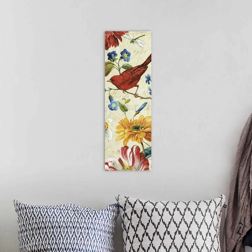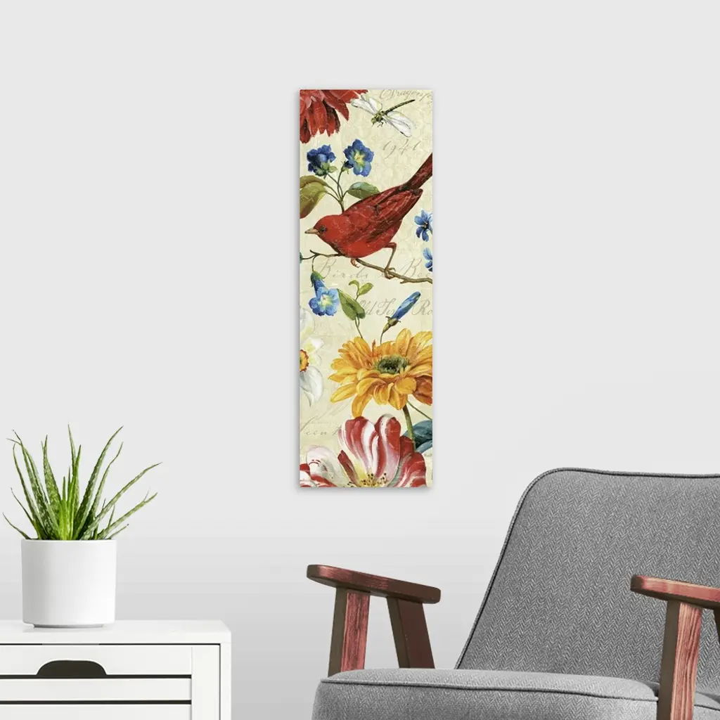 Tall panoramic painting of a bird sitting on a limb with flowers and a dragonfly surrounding him.
