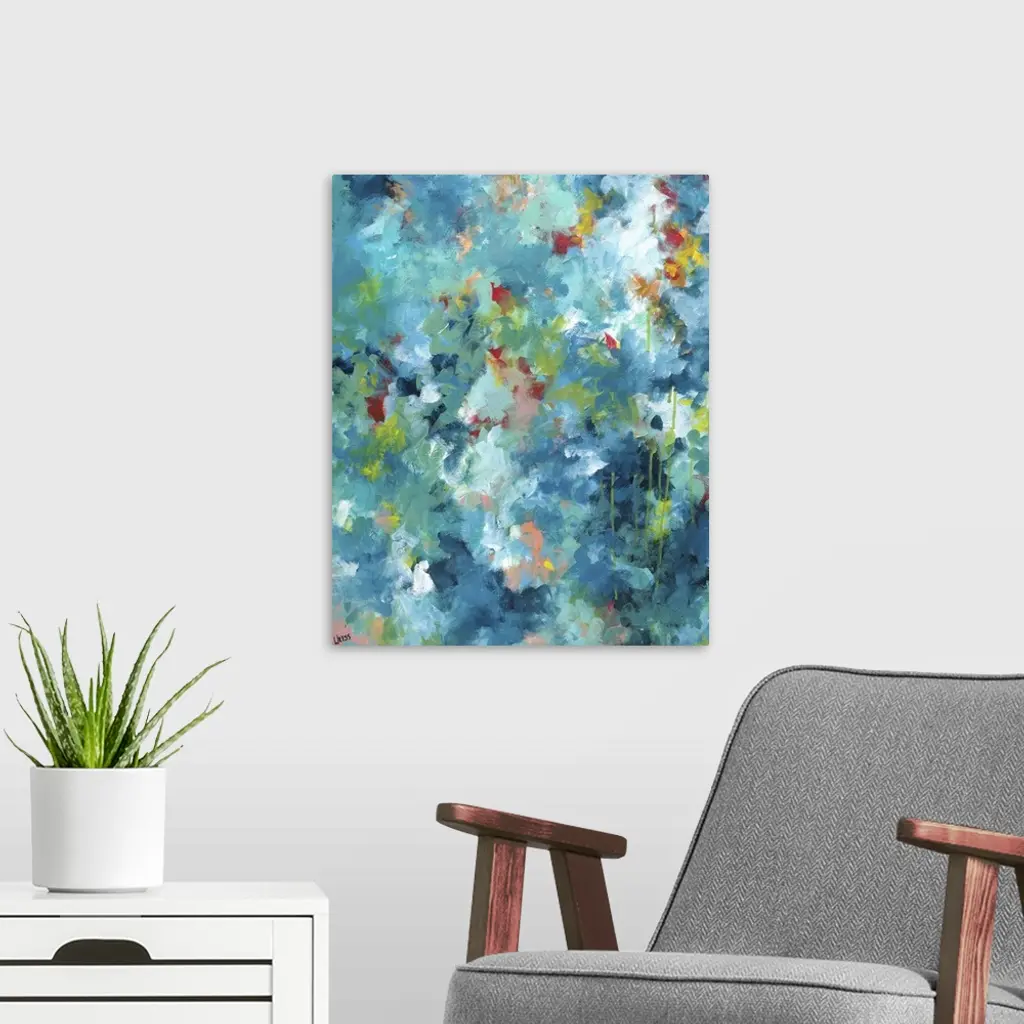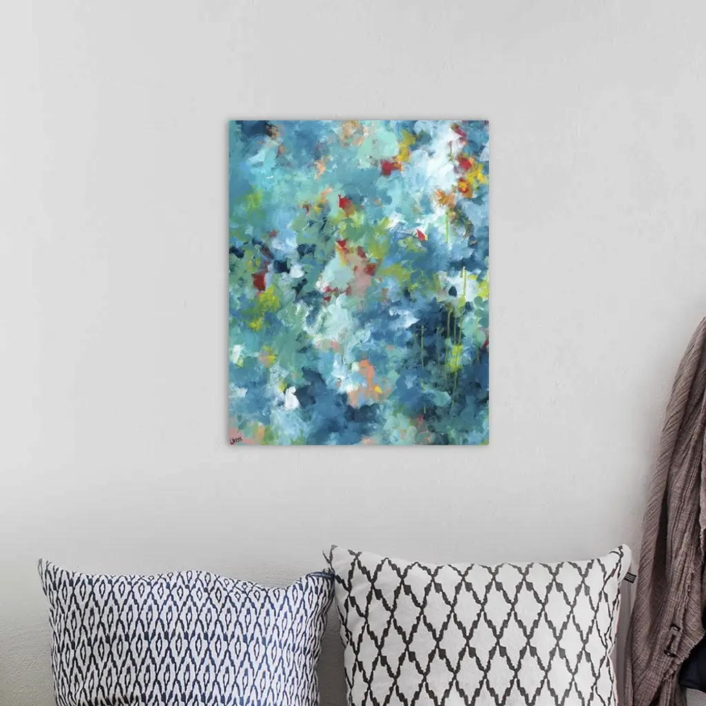 Abstract contemporary painting in teal and green tones, reminiscent of the tones found in a tropical forest.